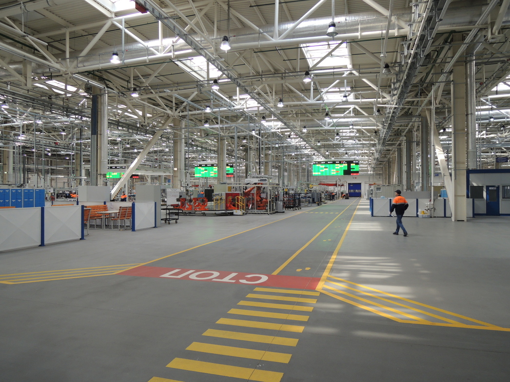 На мой вопрос, как здесь работается, Зульфия ответила: «Чисто, красиво, очень комфортно и тихо, но на соседнем заводе я раньше собирала Ford Transit, там конечно поинтереснее было. Могу вручную целый фургон собрать». Да, сразу же вспоминаются и «горящая изба», и «конь на скаку»... Кстати, прямо в центре цеха расположены зоны отдыха для рабочих — кухня с микроволновкой, кулеры с водой, шкафчики, столы и скамьи. В большой столовой можно вкусно и сытно поесть чуть больше, чем за 100 рублей. Движение транспорта и пешеходов в цехах осуществляется строго по разметке, словно на улице, есть даже светофоры и перекрестки. Все сотрудники ходят в одинаковой яркой сине-оранжевой униформе со светоотражающими полосками.