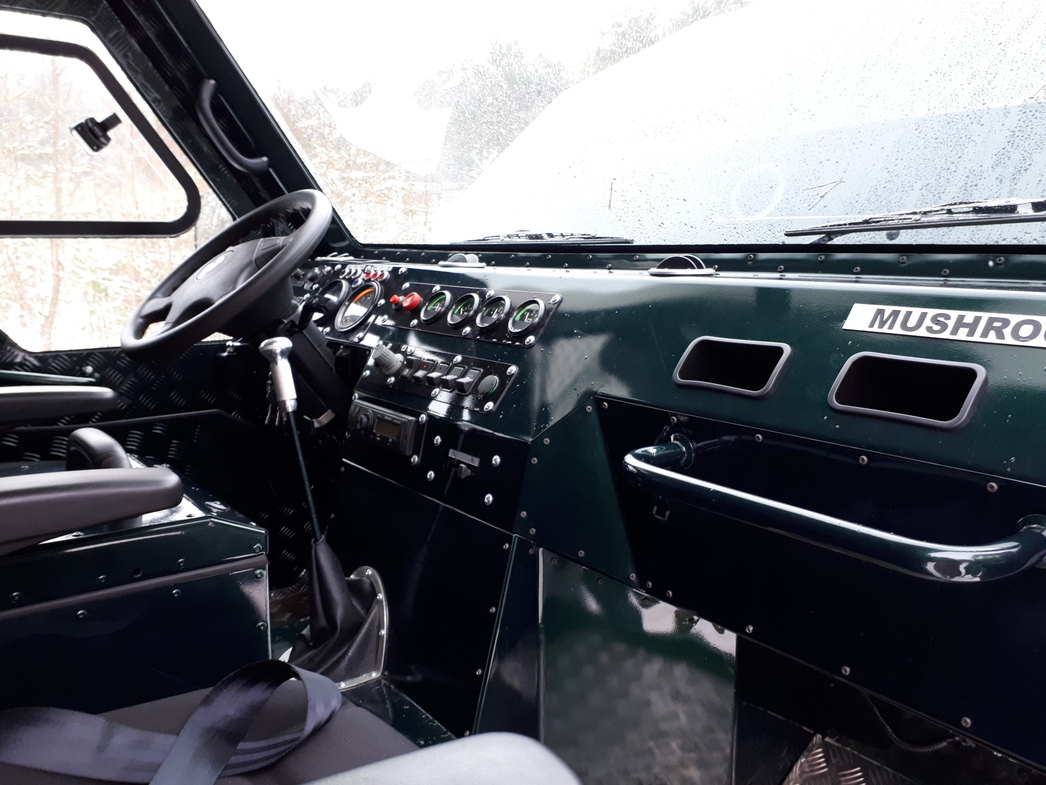 У двигателя нет жидкостной системы охлаждения, и это снизило его массу до 350 кг. Еще одни плюс: мотор «Грибника» расположили так, что развесовка по осям получилась идеальная — 50:50! Коробку передач взяли уазовскую четырехступенчатую. Раздаточная коробка — от «Соболя». На нее установили блок электропневматического включения межосевой блокировки и пониженной передачи, которые активируются клавишами из салона, а не механическими рычагами. Очень удобно. Ну а в кузов влезает тонна груза, которую Mushroomer может таскать по любой грязи и оврагам!