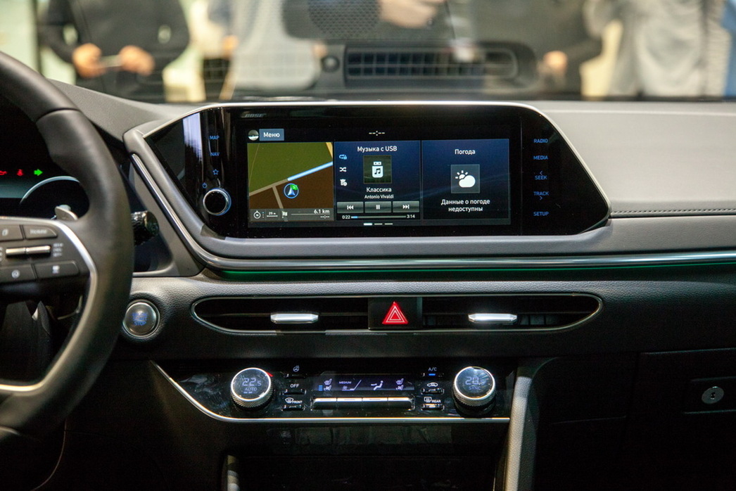 Затронув тему мониторинга пространства вокруг автомобиля, стоит упомянуть о наличии у новой «Сонаты» камер кругового обзора, парктроников и радаров, а также системы безопасности, которые реализованы на их базе: контроль полосы движения и удержания в центре полосы, экстренного торможения, предотвращения столкновения при выезде с парковки задом, адаптивный круиз-контроль и т. д. А адаптируя седан к российским погодным реалиям, его оснастили пакетом теплых опций и увеличенным дорожным просветом.