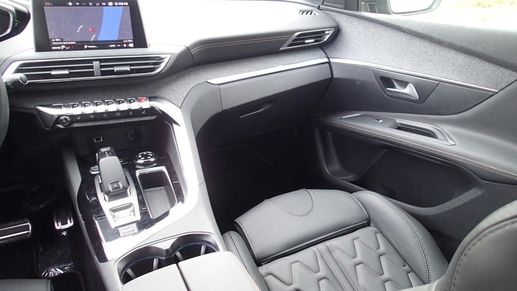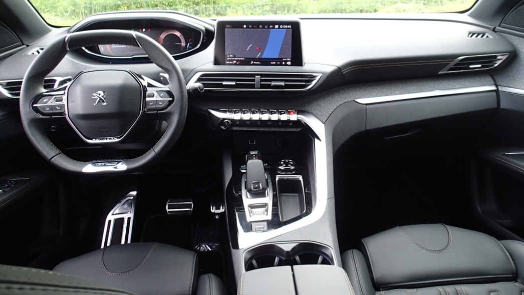 Концепция оформления интерьера новой модели обозначена, как Peugeot i-Cocpit — это фактурные апартаменты в стиле жесткого хайтека, которые пестрят нестандартными решениями. Например, миниатюрный штурвал, «срезанный» не только снизу, но и сверху, имеет форму эллипса, а традиционные кнопки управления медиасистемой и различными функциями заменены двумя ровными рядами изящных клавиш, один из которых хромированный. За переключение трансмиссии здесь отвечает компактный джойстик нестандартной формы, низко заваленный вперед. Еще одно неожиданное решение — оригинальная серая ткань в средней части торпедо, сильно напоминающая джинсовую. Функцию панели приборов в новой модели выполняет объемный 12,3-дюймовый дисплей, широко растянутый по горизонтали. Единственной стандартной вещью можно считать 8-дюймовый монитор медиасистемы в виде планшета в верхней части торпедо.