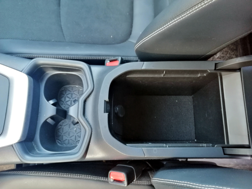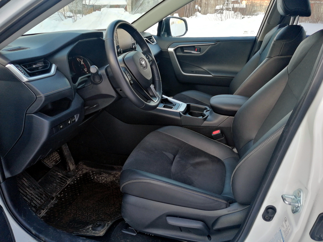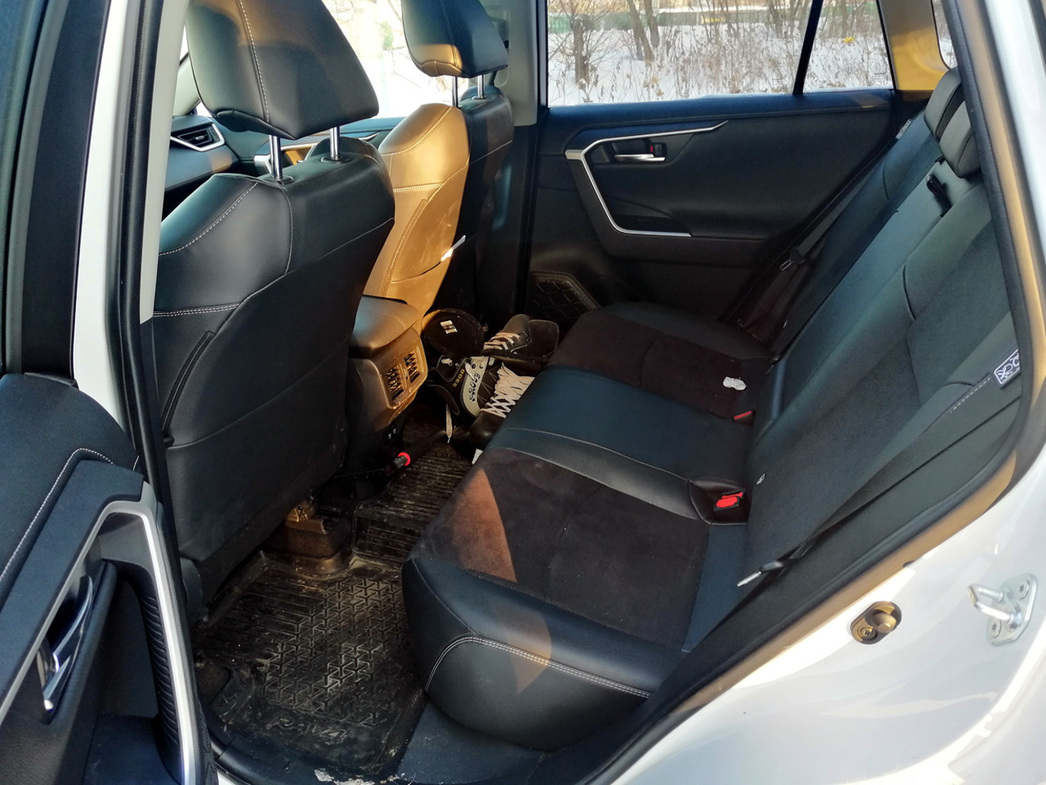 Давайте заглянем внутрь. По ощущениям салон стал просторнее, нежели у предыдущего поколения. Оно и понятно, ведь у RAV4 увеличилась колесная база (за основу взята платформа новой Camry), благодаря чему у задних пассажиров появились дополнительные 5 сантиметров между коленками и впереди стоящим креслом.