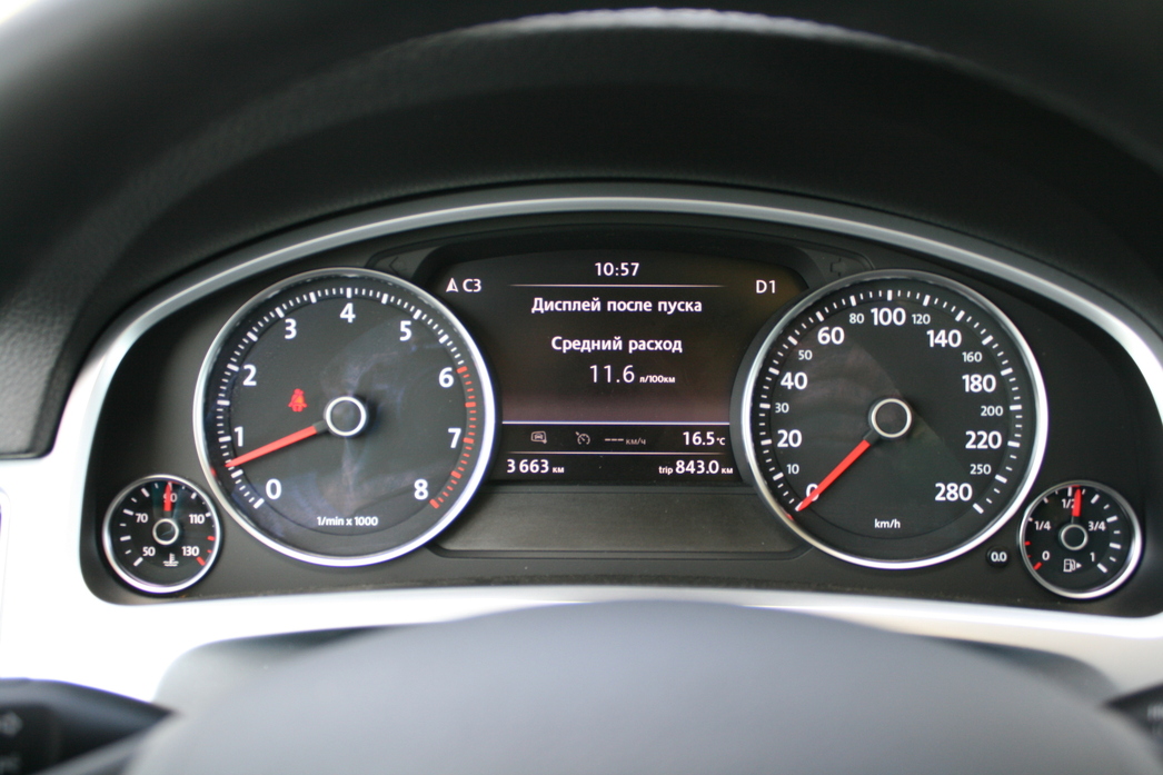 И внутри все то же, что и у дорестайлингового Touareg. Не считать же за серьезный «прорыв» пару новых кнопок на центральной консоли – подогрева «лобовухи» и руля. Правильный, на самом деле, ход – вытащить эти функции из глубин меню на дисплее центральной консоли и подсунуть их под руку водителю. Но самое смелое изменение в интерьере – на приборке. Стилисты решились на отчаянный шаг: осмелились сменить цвет ее подсветки. Раньше она была красноватой, а теперь стала белой!