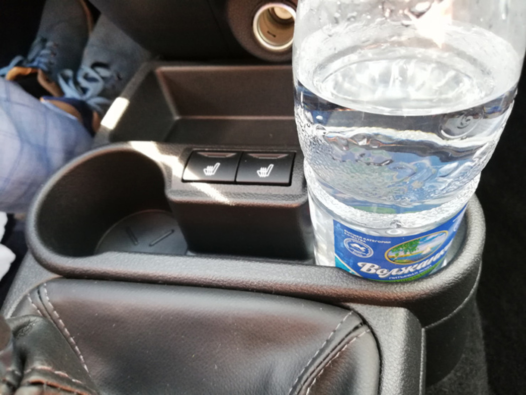 Хотя, положа руку на сердце, назвать подстаканниками два круглых углубления — язык не поворачивается. Объективно, стандартный стаканчик с кофе, покупаемый на заправке, сюда входит с большой натяжкой, но вот поллитровая пластиковая бутылка воды помещается без замечаний. Видимо, такая тара и вдохновила на подвиг создателей этих псевдоподстаканников.