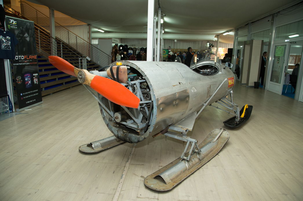 Внимание привлекали и самодельные снегоходы всех мастей — от ярчайших образцов дендро-фекальной конструкторской школы, до вполне годных и приятных аппаратов. Самым интересным из которых стал снегоход ГМВ-2, построенный в 70-х годах прошлого века. Только представьте кабину самолета ИЛ-28У, водруженную на четыре самодельных лыжи и гусеницу — где бы найти для него гравицапу! Больше того, в соседнем павильоне стоял и кармический родственник этого пепелаца, правда его корпус был сделан из какой-то ракеты.
