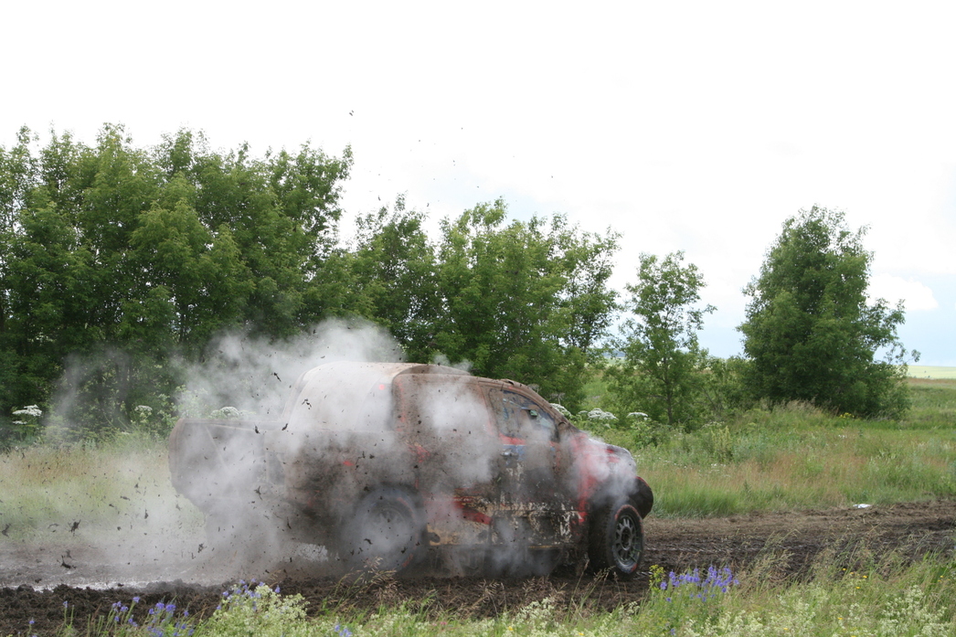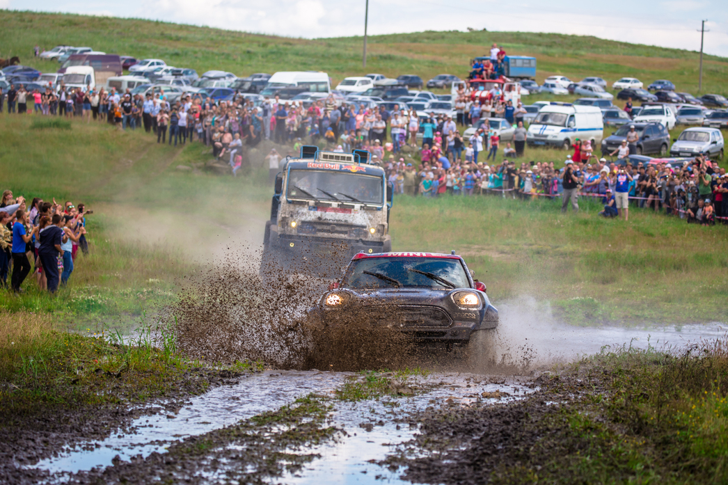 Второй день был намного суше предыдущего — всего лишь несколько бродов на зрительских точках. В Челябинской области началась классическая степь, как бы прелюдия к покорению Казахстана. Высокая трава, неожиданные ямы и валуны (отличительная черта этих мест), коварная схема степных дорог и как следствие — частая смена направления гоночного маршрута. Именно поэтому француз Сириль Депре на 8-й минуте гонки застрял в канаве и отстал от коллег по Peugeot.