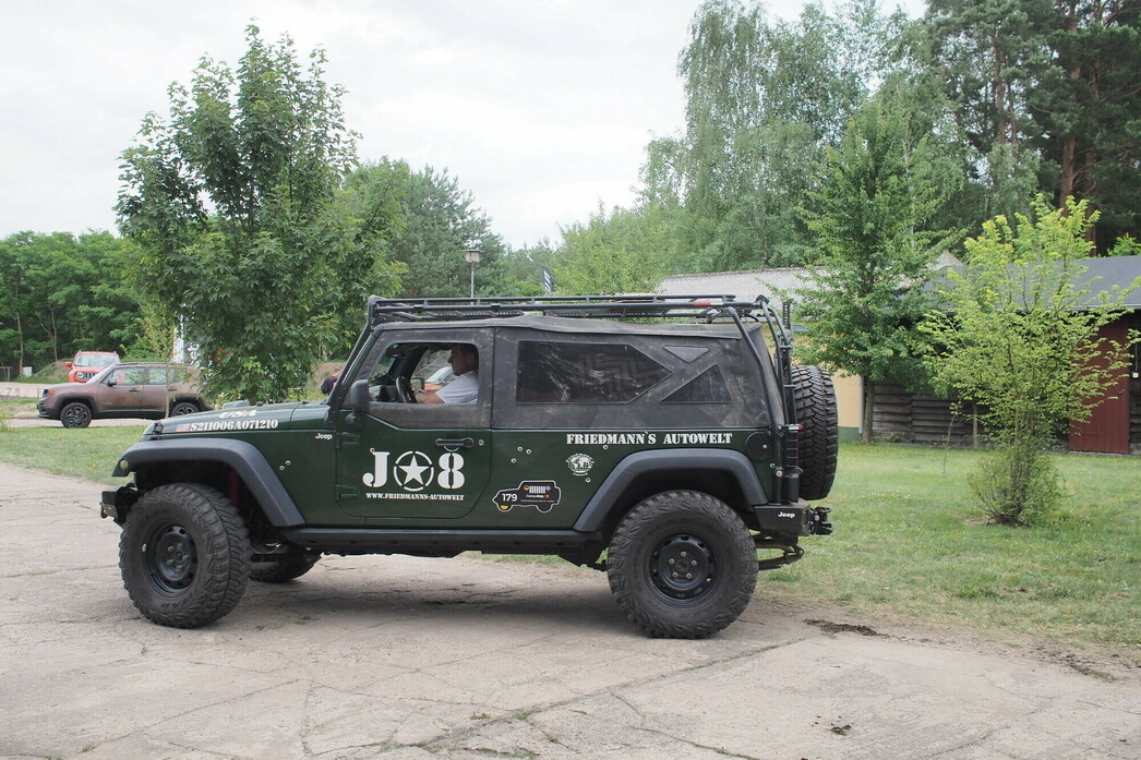 На самом виду, конечно же оказались обширные парковочные площадки, на которых гости оставляли свои машины. И, надо заметить, что помимо вполне серийных «Джипов» там можно было наткнуться на весьма интересные экземпляры. Например, Renegade Rat Rod привлекал внимание зевак своей потрясающей матовой окраской кузова. Неподалеку от него спрятался в кустах пикап Wrangler проекта JK8 — автомобиль не новый, но в России весьма редкий. Мне лично его встречать не доводилось ни разу. Помимо прочего, он был серьезно подготовлен для внедорожных подвигов — в чем нетрудно убедиться, взглянув на его колеса и подвеску.