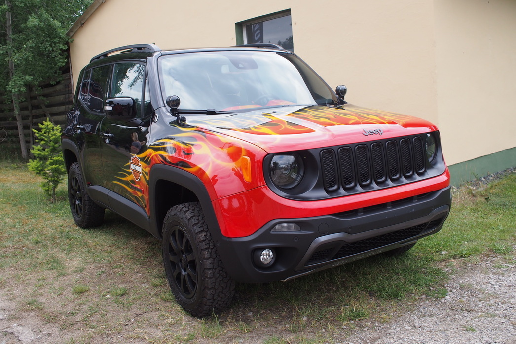 На боковой дорожке, ведущей к пресс-центру, мы заметили еще один уникальный автомобиль — особую версию Renegade, построенную в честь мотоциклов Harley-Davidson в единственном экземпляре итальянским тюнинговым ателье Garage Italia Customs, в 2016 году и получившую название Hellʼs Revenge в честь знаменитой американской внедорожной трассы.