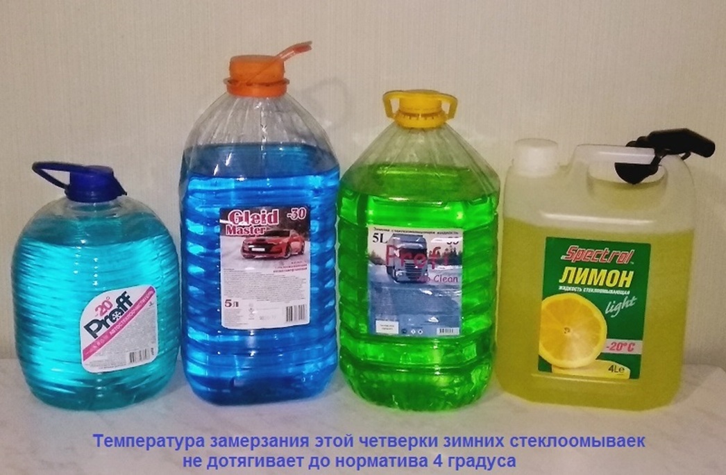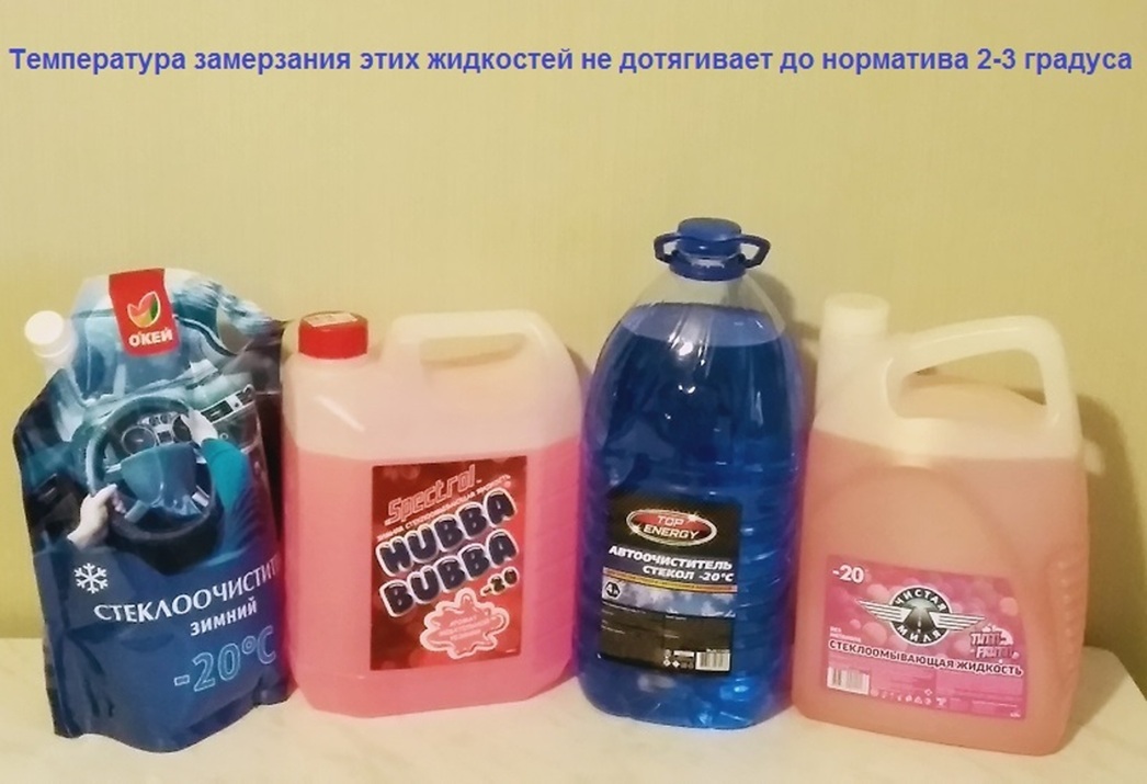В этом сезоне для контрольных испытаний эксперты «АвтоВзгляда» совместно с порталом «АвтоПарад» закупили в сетевых магазинах и розничных торговых точках десять стеклоомываек. Девять из них российские, и лишь один — лицензионный продукт, выпускаемый в Подмосковье по рецептуре немецкой компании Liqui Moly. Большинство образцов («Чистая миля» −20C, Proff −20С, Top Energy −20C, «Чисто Плюс −20С», Liqui Moly Antifrost −20С, «ОКей −20С» а также «Лимон Light −20» и Hubba Bubba −20C марки Spectrol) содержат жидкости с заявленной температурой замерзания −20 градусов. Еще два образца — Profi −30C и Gleid Master −30C — составы, которые, согласно данным на этикетках, должны выдерживать 30-градусный мороз.