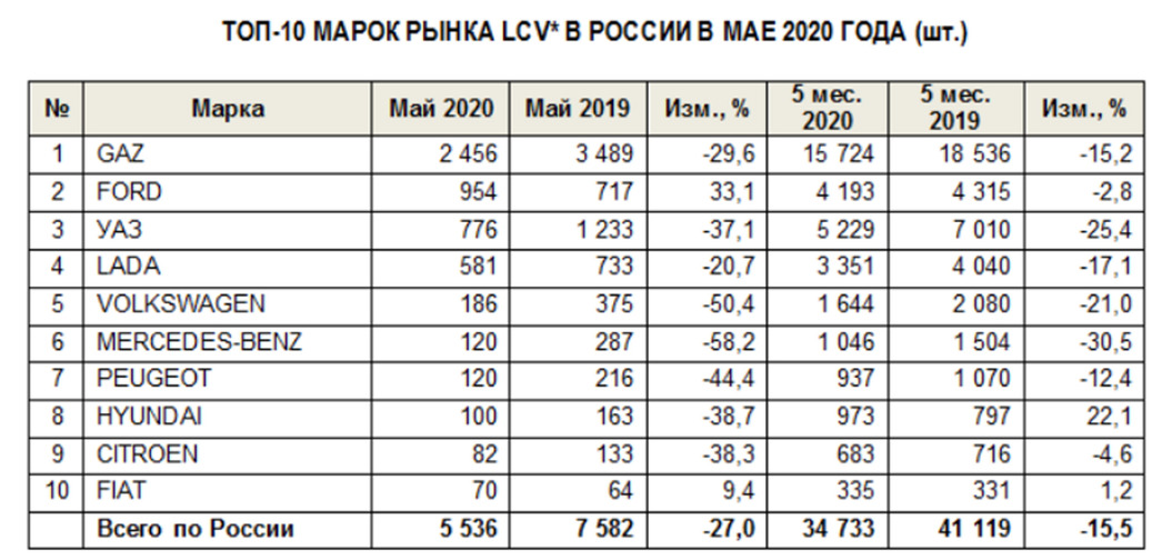 Но в целом, повторимся, рынок легкого коммерческого транспорта просел в мае на 27%, а положительную динамику тут показали только Ford (+33%) и FIAT (+9,4%).