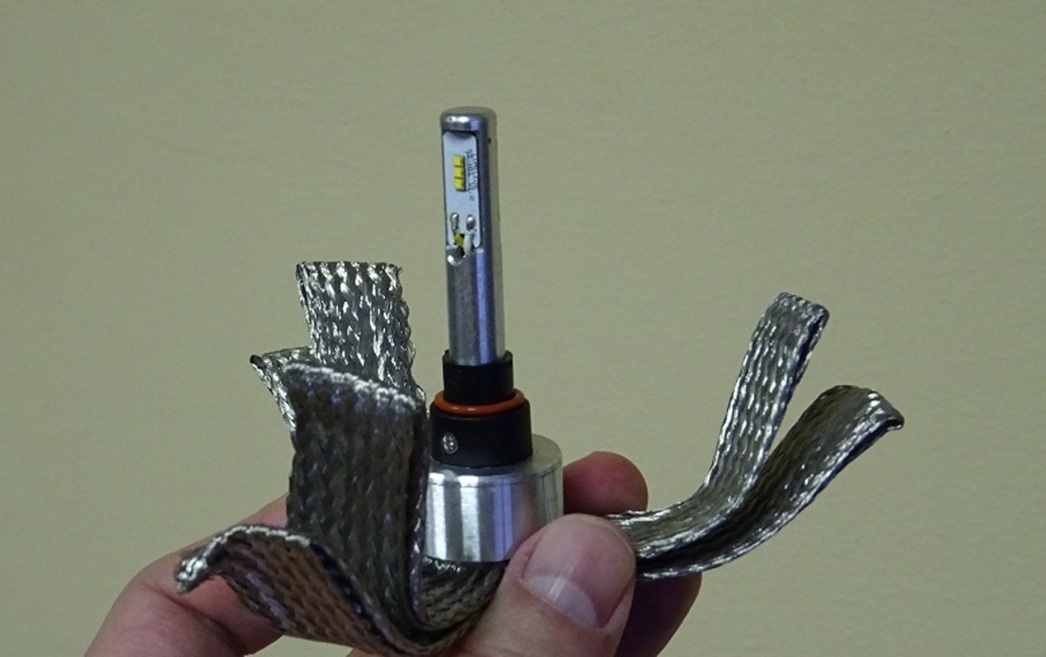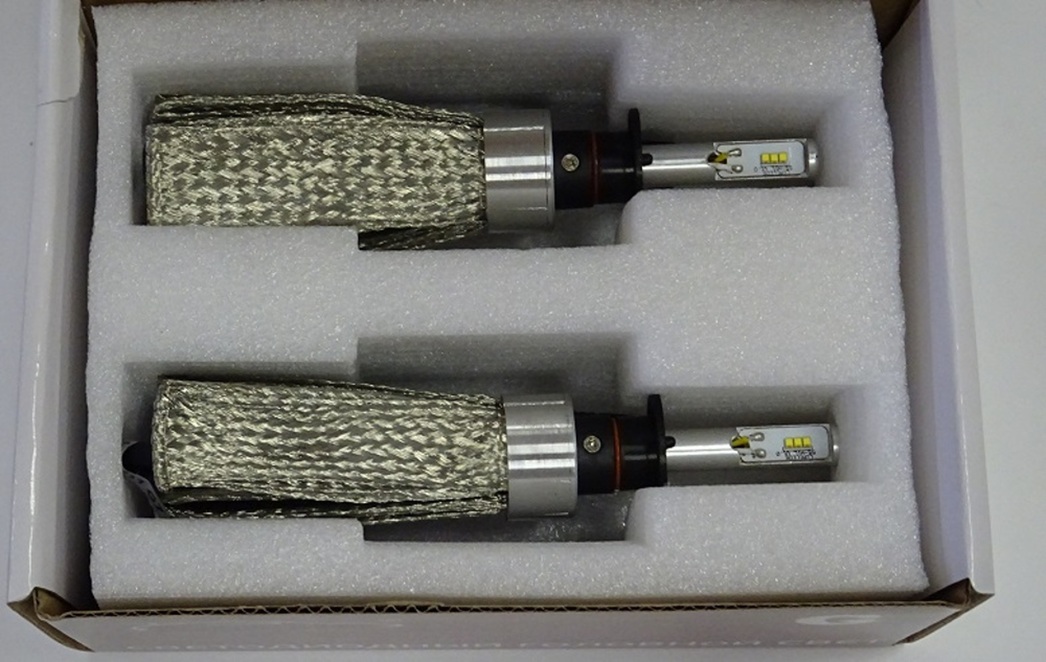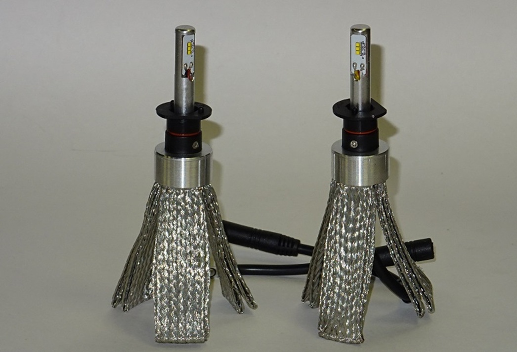 Итак, что же представляют из себя светодиодные лампы головного света серии G7? Пожалуй, наиболее заметной конструктивной особенностью этих изделий, видимых даже невооруженным глазом, является модуль отвода тепла, схема которого реализована более чем оригинально. Как видим, разработчики здесь полностью отказались от громоздкого радиатора. Его роль выполняют три мягкие (их особой анодированной меди) плетенные пластины, лучами расходящиеся от цоколя. Такое исполнение теплообменника имеет бесспорное преимущество в сравнении с обычными радиаторами, массивные ребра которых, как известно, всегда «выпячены» в сторону моторного отсека.