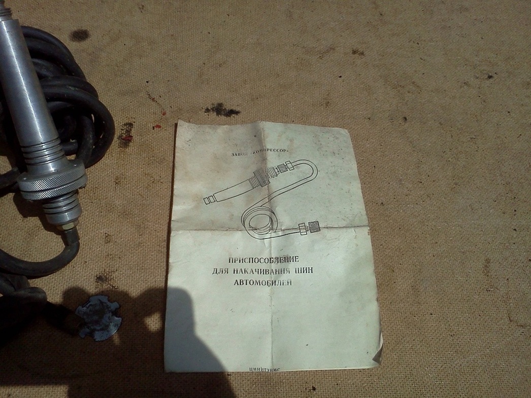 Состоял «девайс» из шланга, длины которого хватало, чтобы дотянуться от моторного отсека до все колес и насадок, с нарезанной как у свечей зажигания резьбой — с одной стороны, и под ниппель — с другой. «Приспособа» была довольно простой в применении. На место выкрученной свечи вкручивался данный шланг и запускался двигатель. Отключенный поршень, собственно, и выполнял роль насоса: идет вниз — тянет воздух, поднимается вверх — толкает его в колесо.