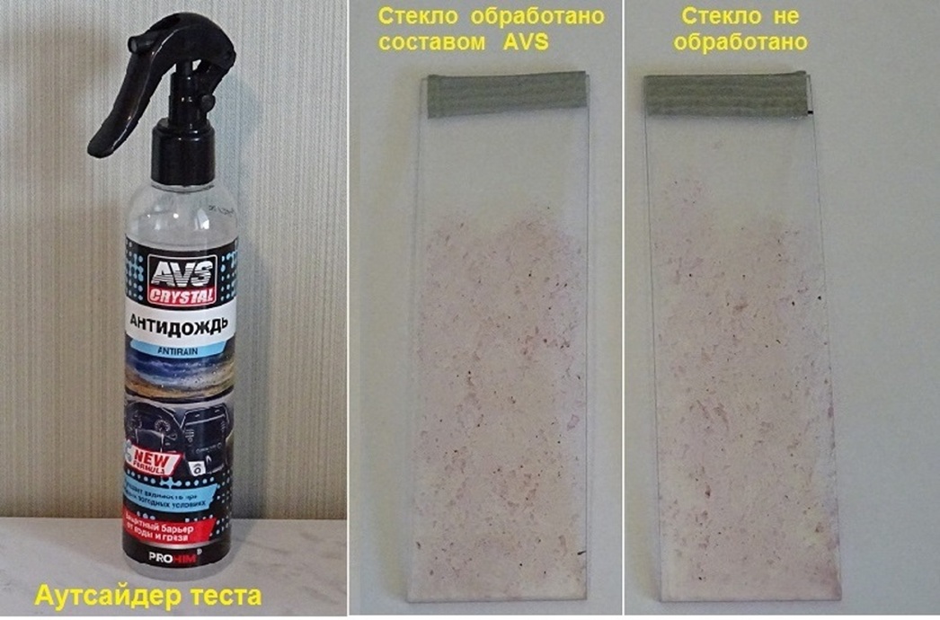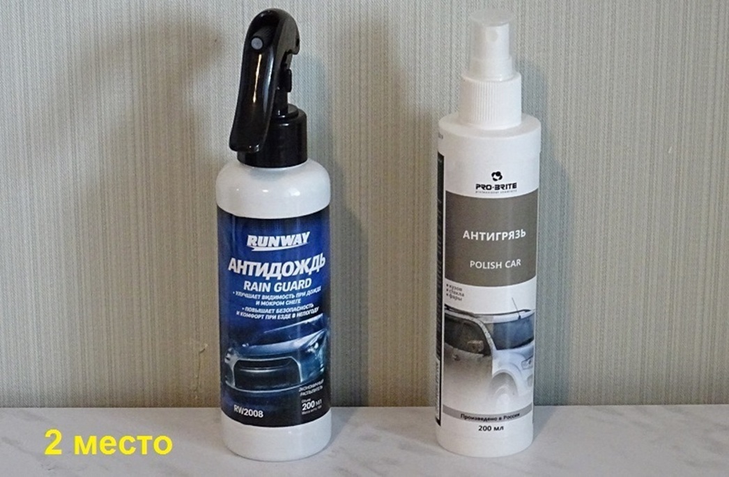 Четыре из них — полностью антидождевые спреи брендов Runway, AVS, Hi-Gear и Ruseff. А вот пятый продукт — довольно неординарный состав под названием «Антигрязь» марки Pro-Brite, предназначенный для защиты не только стекол, зеркал и фар, но и кузова.