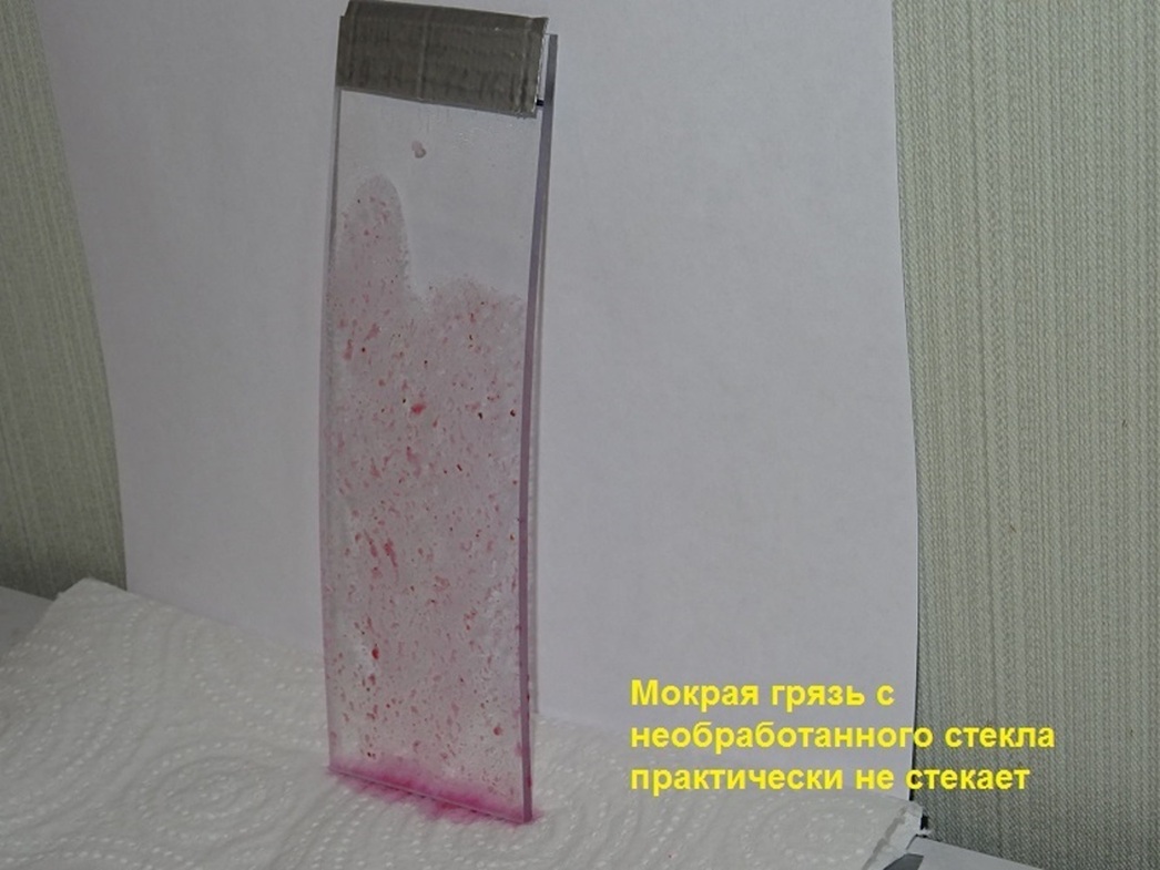 После такой процедуры контрольную пластину ставили вертикально и сравнивали с исходным образцом, то есть стеклом, которое загрязнялось без предварительной обработки «антидождем». Критерий оценки таков: чем меньше грязи (в сравнении с «исходником») осталось на поликарбонатной пластине, тем лучше. Такое визуальное сопоставление (фото ниже) дало возможность разделить участников испытаний по группам и тем самым позиционировать каждый образец по степени эффективности.