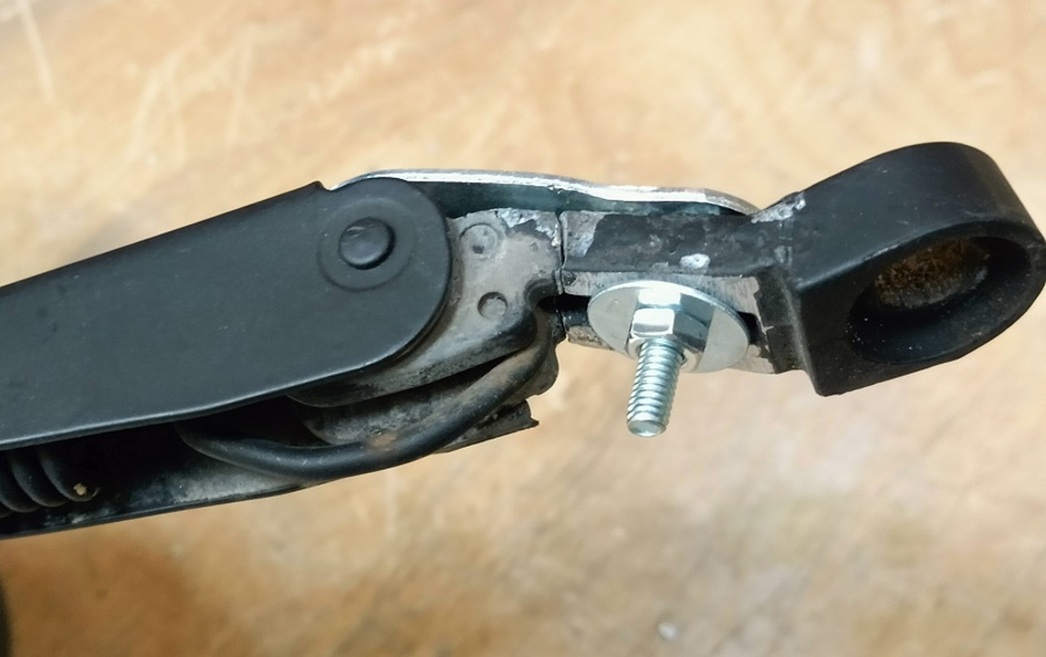 В итоге, после поиска по гаражным «сусекам», для стяжки с наружной стороны коллеге удалось подобрать завалявшуюся пластину-проушину от мебельного крепежа. Она идеально подошла по своим размерам и прочностным параметрам к поломанному рычагу. Дополнительную прочность наружному соединению обеспечили два болта М4 с гайками.