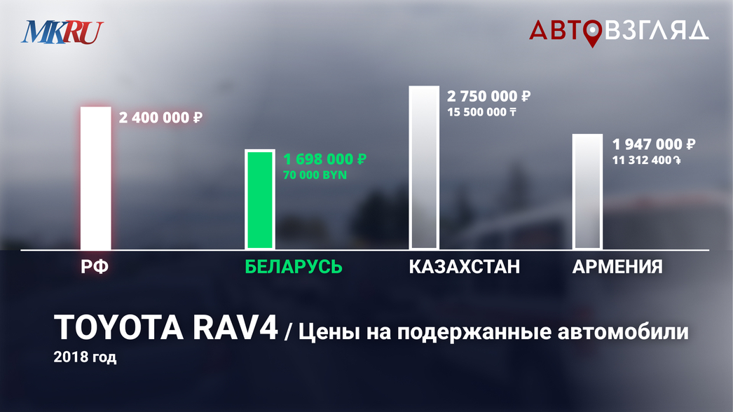 Россиянам проще всего привезти автомобиль — не важно, новый или подержанный — из стран Таможенного союза, ведь на его территории действуют единые регламенты. При этом именно в Белоруссии, как показало исследование портала «АвтоВзгляд», машины с пробегом самые дешевые. Судите сами: если за Toyota RAV4 2018 года выпуска в России просят в среднем около 2,4 млн рублей, в Армении — 2 млн, а в Казахстане — 2,7 млн, то в Белоруссии — «всего» 1,7.