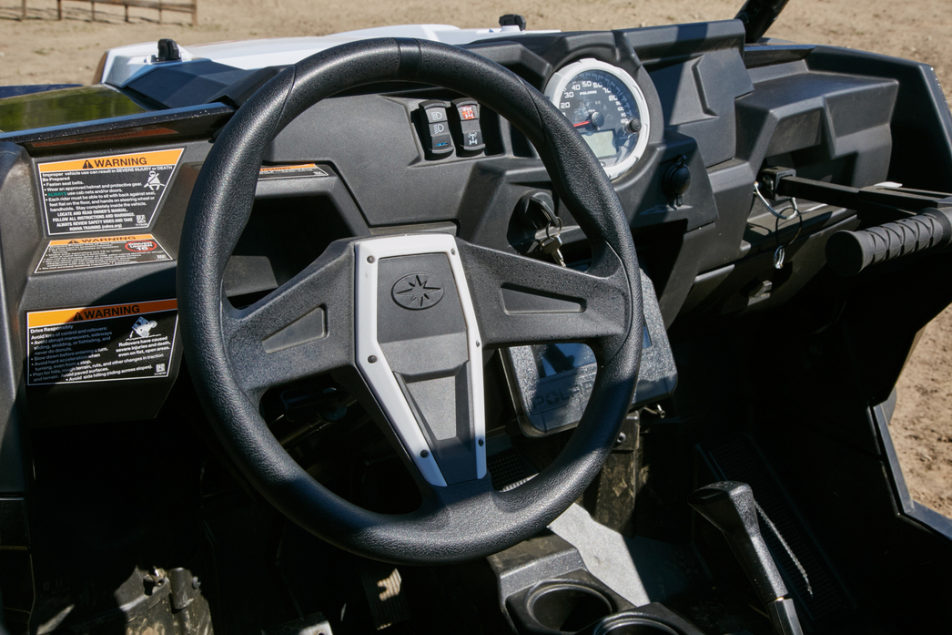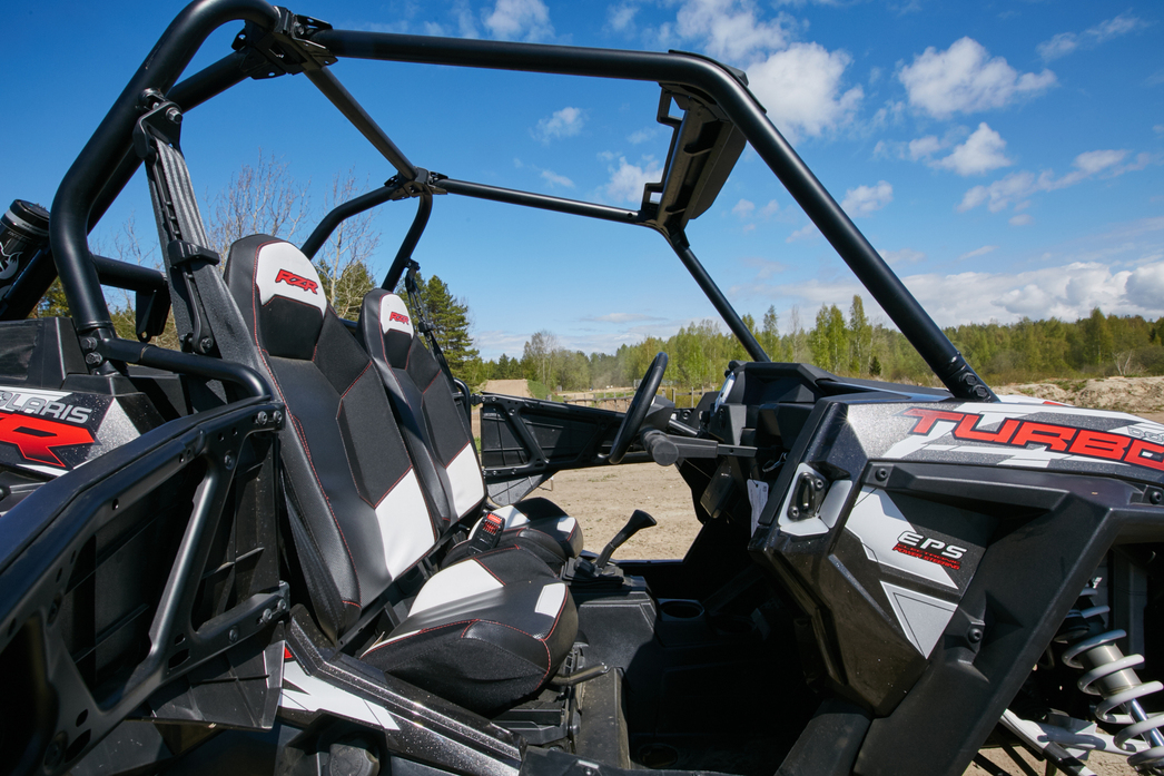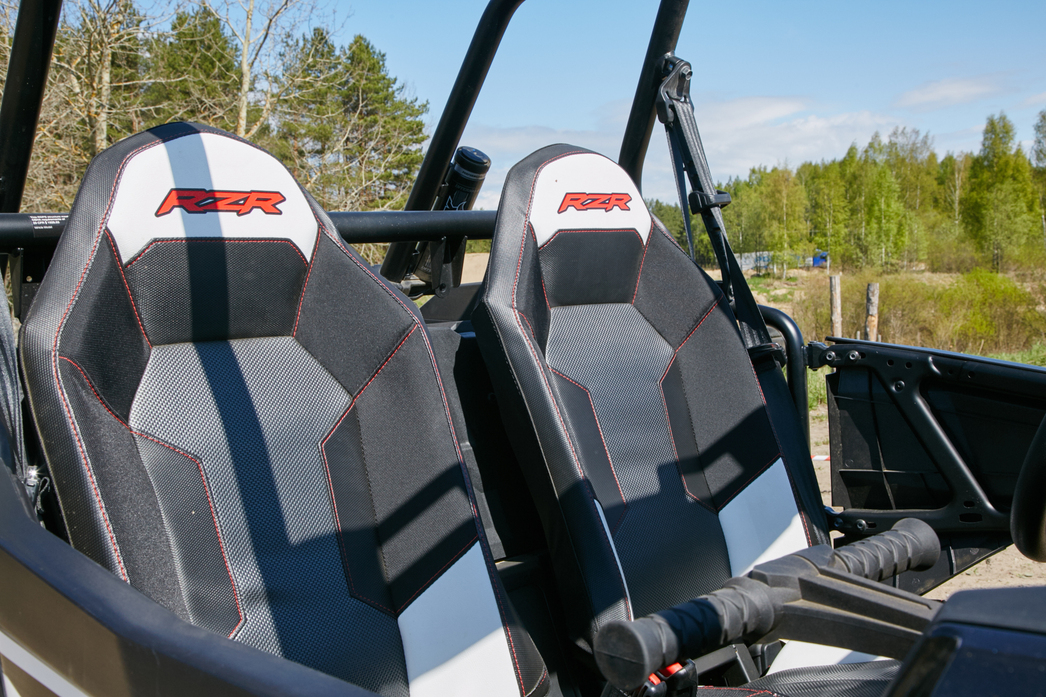 Но буклет с техническими характеристиками Polaris RZR Turbo можно отложить в сторону и перейти к практической части знакомства. Спортивные сиденья-ковши не отличаются повышенной мягкостью, но и вместе с тем нет и ощущения, будто ты сидишь на пластмассовом жестком стуле. Некоторые коллеги жаловались, что у вездехода странная и местами даже неудобная посадка, что педали расположены чересчур близко друг к другу, но мы ничего подобного не выявили. Даже напротив, поколдовав немного с настройками рулевой колонки и сиденья, возникло чувство, будто машину сделали конкретно под тебя.