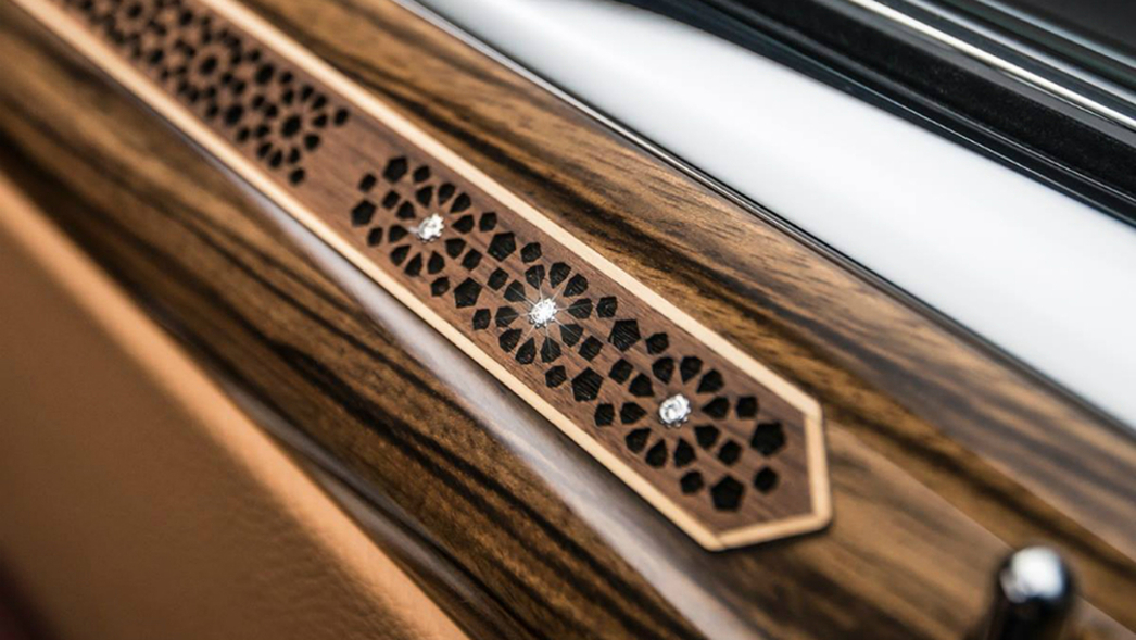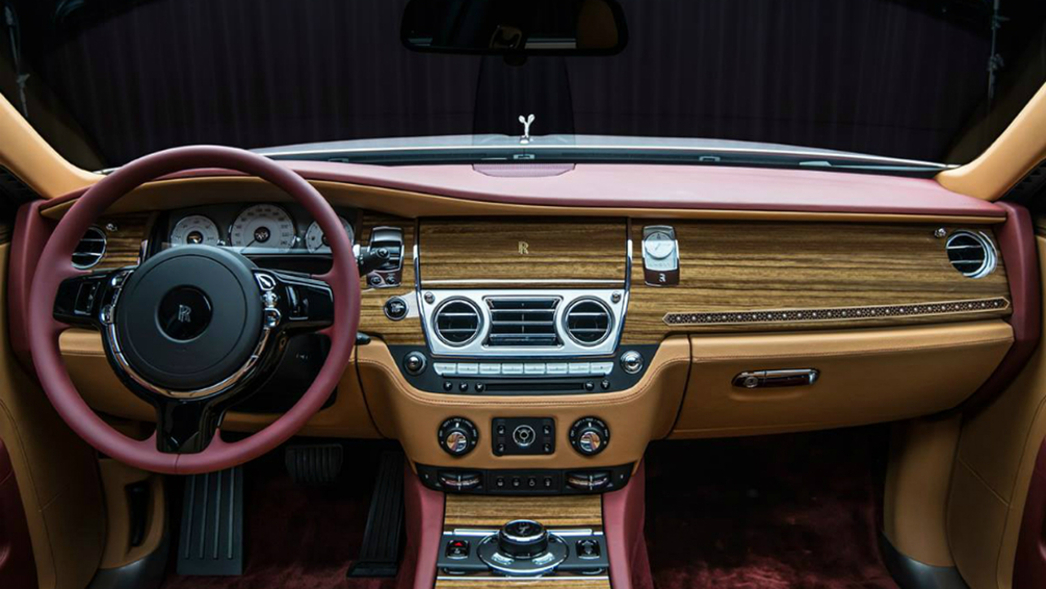 В отделке салона уникального Rolls-Royce использован 41 бриллиант, а также декоративные панели из шпона ценных пород дерева. Сиденья обиты бежевой кожей, рулевое колесо и отдельные элементы интерьера оформлены кожей красного цвета.