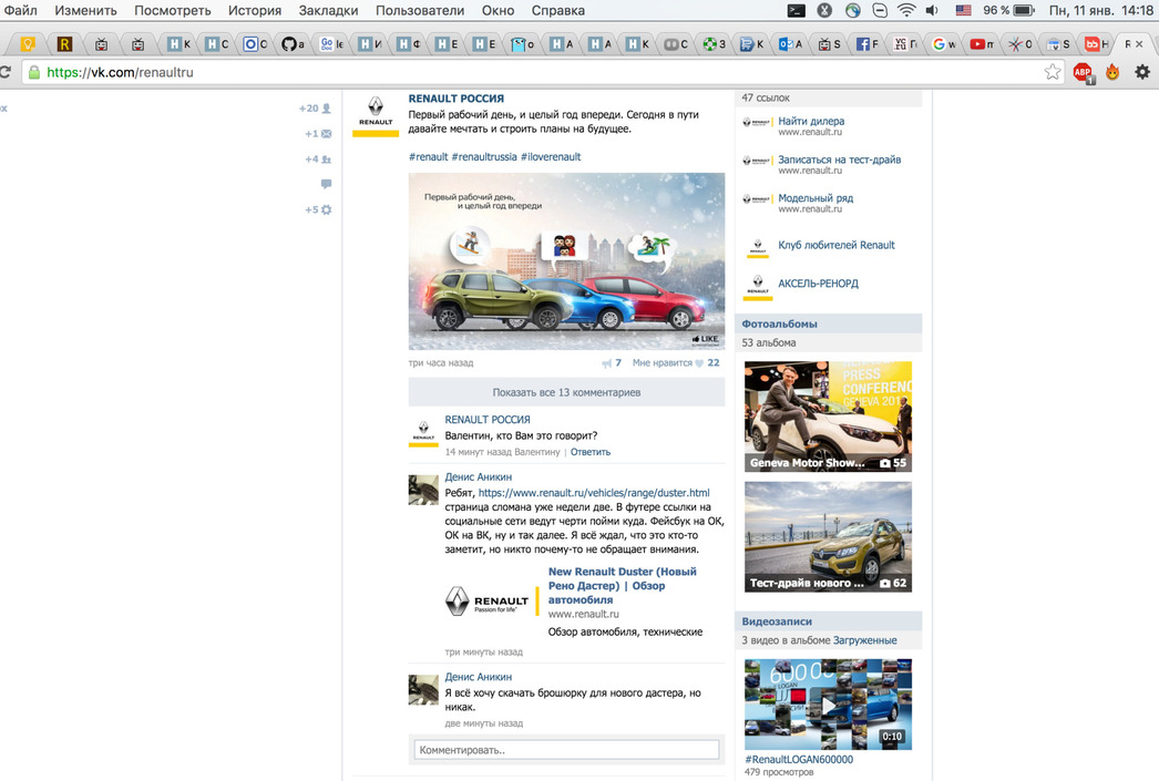 Но как бы ни старались сохранить свою репутацию «реношники», сделать этого им так и не удалось. Журналисты портала «АвтоВзгляд» лично написали в «ВКонтакте» (куда, кстати, с головного сервера марки почему-то можно попасть, лишь кликнув на «Одноклассники», а в «Одноклассники» – через Facebook) об имеющихся на сервере проблемах и попросили администраторов помочь с сохранением брошюры. Но на удивление пост был тут же удален, а через шесть часов последовал ответ, а точнее, вопрос: с официального ли сайта мы пытались ее скачать? Что тут скажешь – уж если в таких мелочах эти ребята прокалываются и проявляют равнодушие к клиентам, то о надлежащем обслуживании в реальном времени говорить не приходится и вовсе. Впрочем, недавно мы уже рассказывали, как беспардонно себя ведут и обманывают менеджеры в дилерских центрах Renault, а также о том, как по-тихому, минуя Росстандарт, отзывают бракованные Duster.