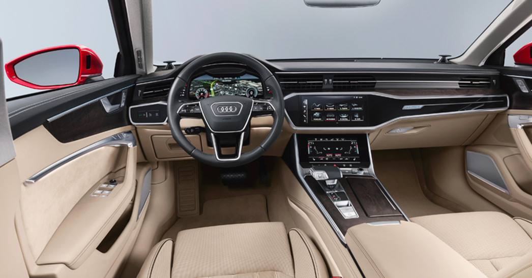 Интерьер в общем и целом также напоминает салон A7, и здесь сделан акцент на сенсорное управление, которое почти полностью заменило аналоговое. За все регулировки отвечают два монитора.