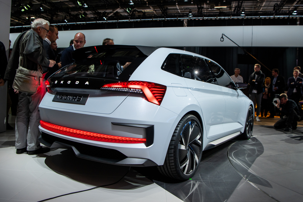 Skoda Vision RS получил рельефный пластиковый обвес, крупные 20-дюймовые колесные диски с двухцветным дизайном и угловатую радиаторную решетку со светодиодной подсветкой.