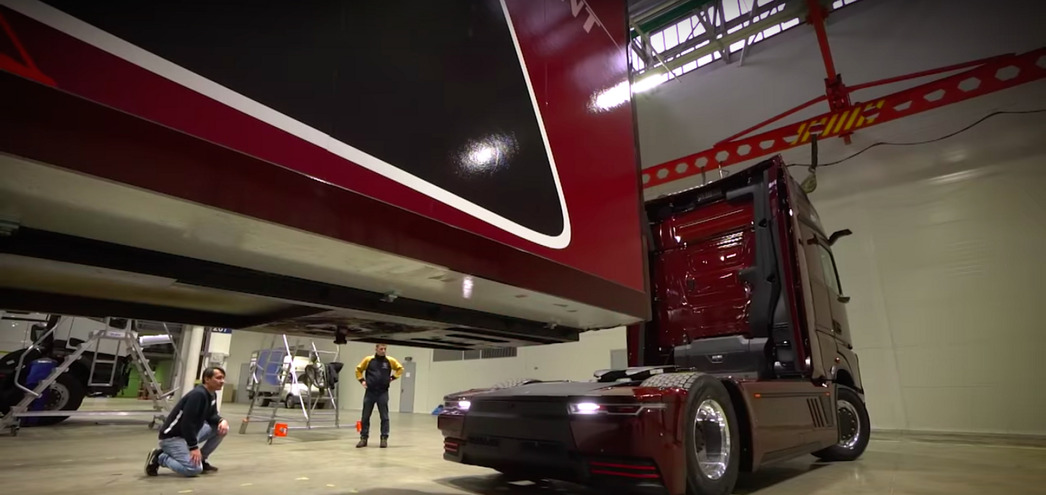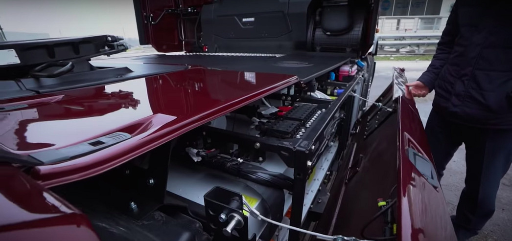 Новый тягач рассчитан на одного водителя. В кабине предусмотрено множество мелочей для комфортных дальнобойных поездок: сейф, микроволновка, умывальник и даже мультиварка. Имеется спальное место и холодильник.