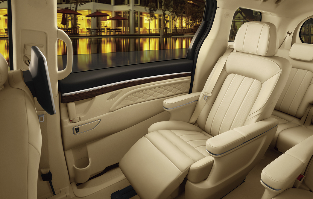 Семиместный минивэн позиционируют, как премиальный автомобиль для бизнеса и больших семей. Второй ряд кресел раздельный, а третий представляет собой полноценный диван. Все сиденья обтянуты кожей, есть массаж, вентиляция и обогрев. А у кресел второго ряда предусмотрена даже поддержка для ног.