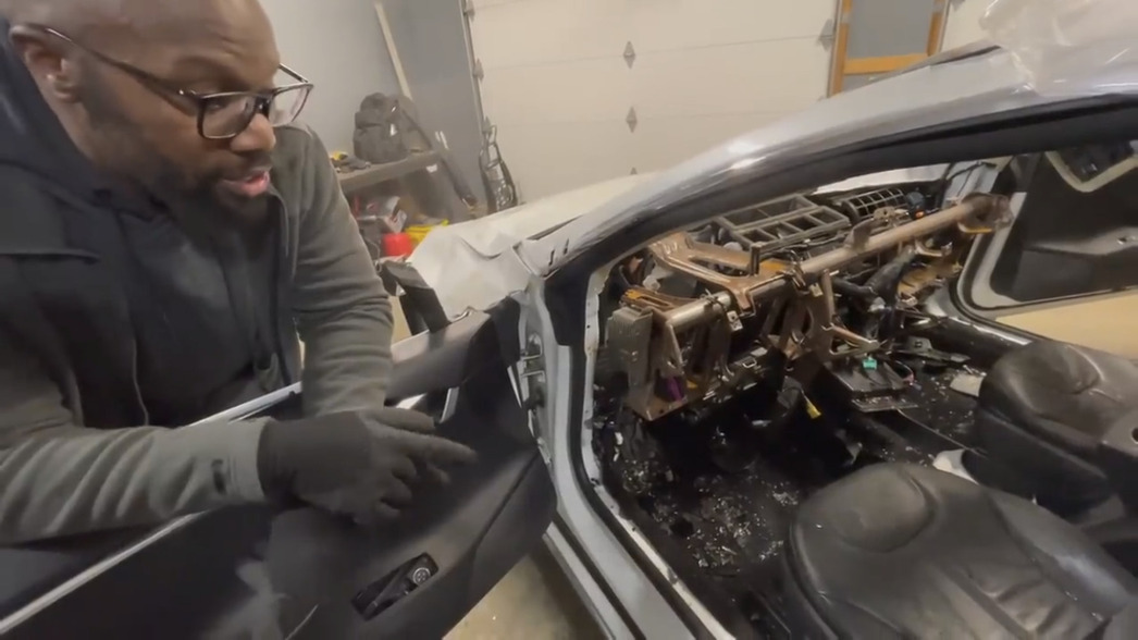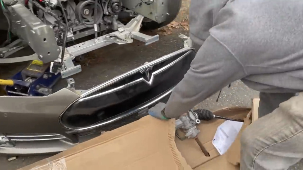 Для проекта ребята под предводительством Рича Бенуа забрали с помойки две выброшенные Tesla Model S, привезли к себе в гараж и первым делом предались азартному вандализму, доломав оставшееся.