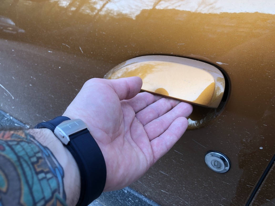 За первый месяц эксплуатации у меня накопился небольшой список раздражителей. Вот, скажем, это наружные ручки дверей. Они жутко неудобны — даже не столько формой, сколько кинематикой. При оттягивании ручка поднимается на большой угол, достаточный для того, чтобы пальцы с нее соскользнули. У меня такое происходит регулярно. И если, скажем, я довольно быстро надрессировался выходить из машины так, чтобы не обтирать джинсами порог, то прописать на уровне подсознание взаимодействие с ручкой так и не смог.