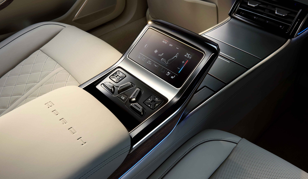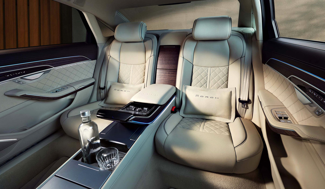 Салон — в самой роскошной версии: с двумя раздельными задними креслами и широченным центральным тоннелем, в котором упрятаны охлаждаемые подстаканники. Вдобавок главным пассажирам доступен небольшой тачскрин медиасистемы. Разумеется, интерьер отделан натуральными кожей и шпоном, а список оборудования занимает не одну страницу печатного текста. Так, у новоиспеченного «Хорьха» имеются лазерно-люминофорные фары, панорамная крыша и многое другое. Правда, до 223-го «Мерседеса» с шильдами Maybach ему пока все равно далековато…