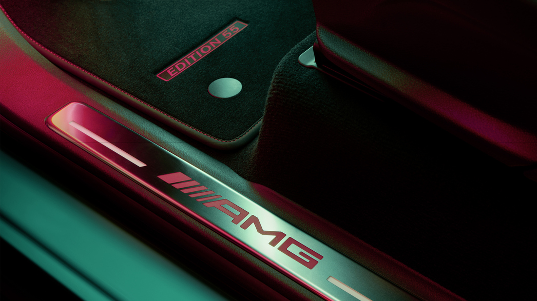 В салоне владельца встретят накладки на пороги из нержавейки, спортивное рулевое колесо и, конечго, сиденья AMG особого дизайна, обшитые двухцветной кожей наппа. Дополняют атмосферу декоративные вставки из матового карбона.