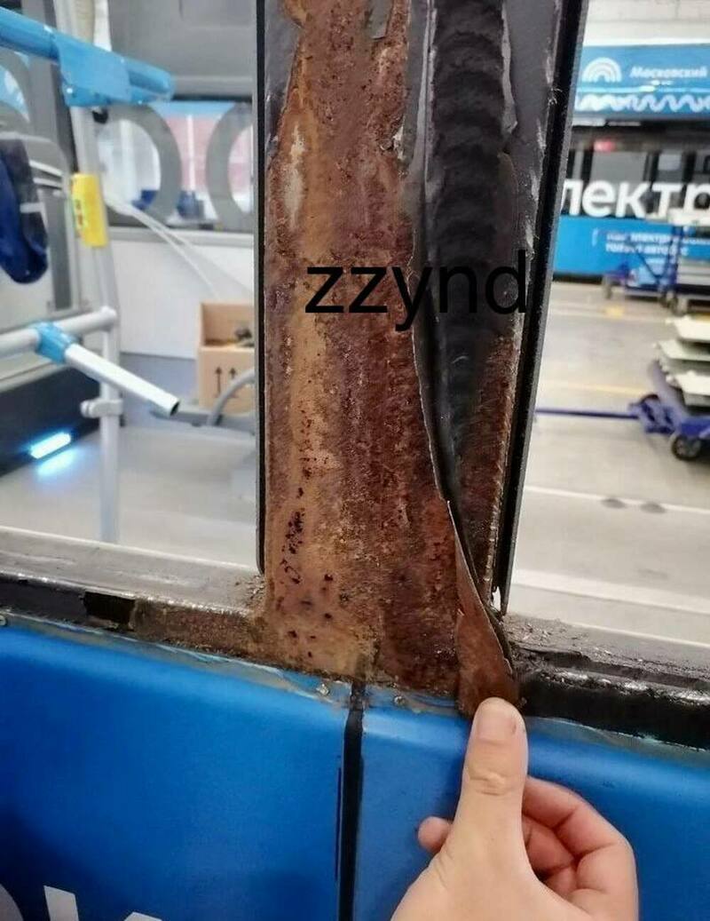 Ряд телеграм-каналов опубликовали, так сказать, подноготную синего московского электротранспорта. На фото видно, что кузова машин за три года эксплуатации на городских линиях покрываются толстым слоем лохматой ржавчины. Причем не точечно, а почти целиком: начиная с колесных арок и заканчивая рамками окон.