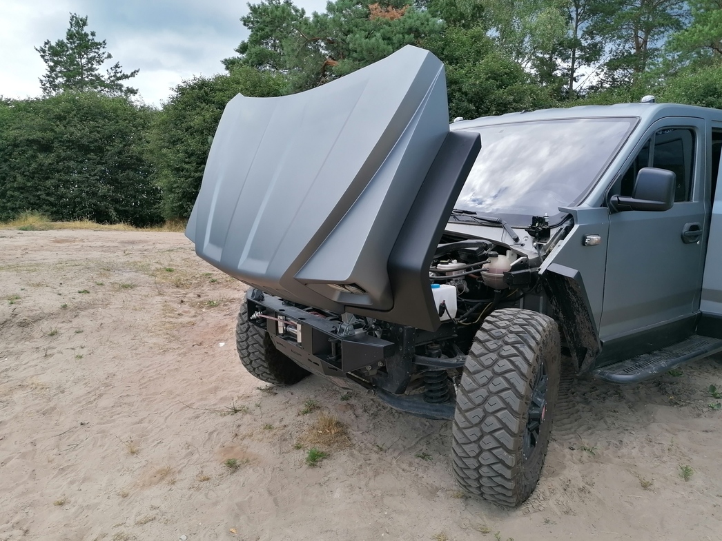 Пятидверный кузов построен вокруг универсального кабинного модуля «Группы ГАЗ», который также подрезан по высоте. Из-за этого пришлось перекраивать передние двери. Остальная часть — от средней стойки до заднего бампера — собственная разработка бауманцев. Как, собственно, и монструозное интегральное оперение, где капот, крылья и решетка — это единое целое.