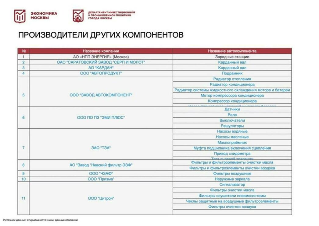 Но в презентации про это не упоминали, лишь обозначив переизбыток заводов, готовых выпускать компоненты исключительно для электромобиля. В России остановилась вся промышленность, оставшаяся без компонентов. Но наличие упомянутых в слайдах фирм почему-то не оживило ни одно из предприятий. Или попавшие в список заводы такие же нарисованные, как и сам электромобиль?