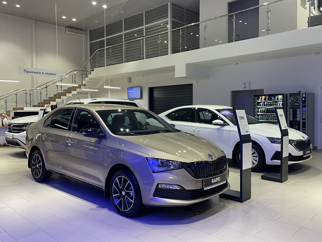 В том дилерском кластере, где мы побывали, Skoda делит «жилплощать» с родственным Volkswagen. Хотя чешских автомобилей там, кажется, меньше: по одному представителю семейств Rapid, Octavia и Karoq. Нас главным образом интересовал первый — «Рапидов», как мы уже сказали, у ретейлера хватает. Правда, совсем не осталось машин на «механике». Самый же доступный лифтбэк с двумя педалями выудит из кошелька 1 960 000 рублей.