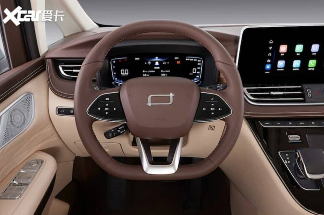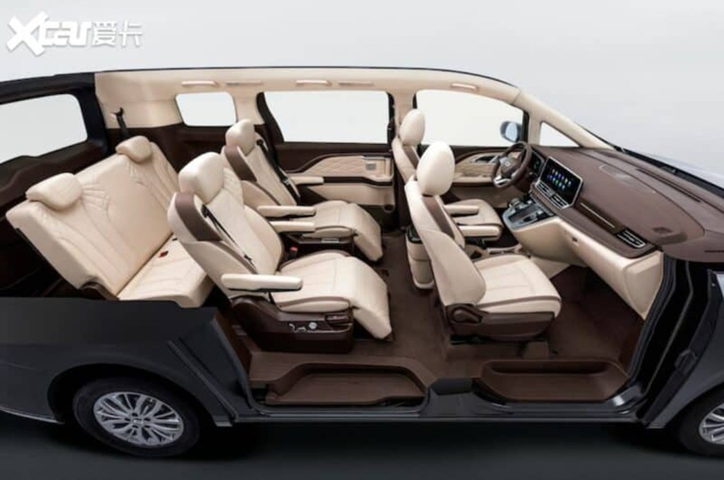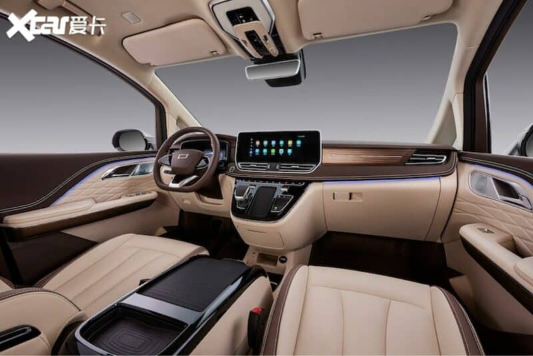 Приборная панель, оформленная «под дерево», должна, судя по всему, придавать имиджу машины налет роскоши. Как и сочетание кремовых оттенков в общем оформлении кожаного салона. Приборная панель минивэна представлена 7-дюймовым ЖК-монитором. Взаимодействовать с мультимедийной системой модели можно через 12,3-дюймовый экран, возвышающийся над центральной консолью. Кроме того, создатели Bestune M9 проявили здравый смысл, сохранив на самой центральной консоли физические кнопки управления опциями.