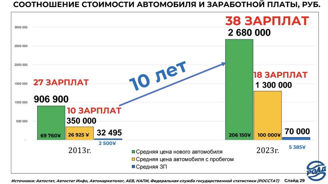 И при всем при этом падение покупательской способности оказалось весьма впечатляющим. Если в 2019 году для приобретения среднеценового автомобиля требовалась 31 средняя же зарплата, то в 2023-м — уже 38 зарплат.