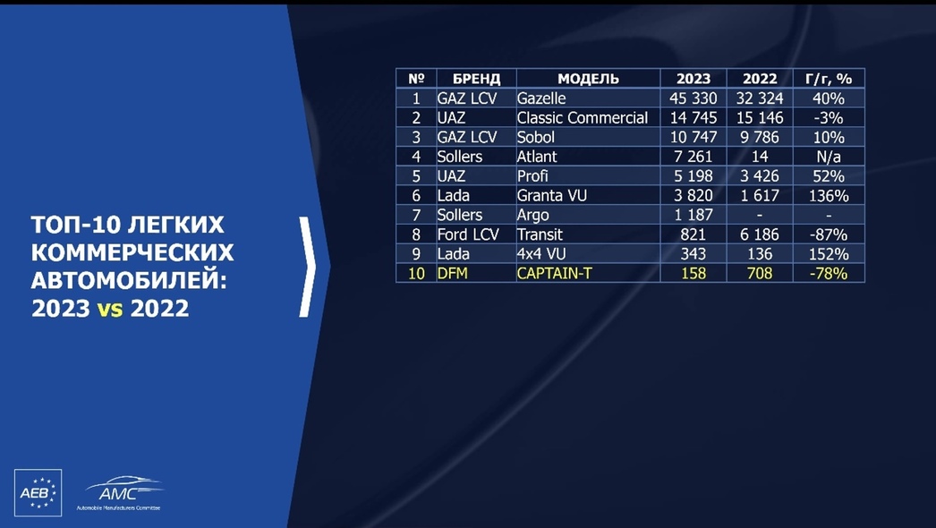 В сегменте легких коммерческих автомобилей традиционно лидирует «Газель». За ней идет УАЗ со своими поделками, значительная часть которых идет в зону СВО. Ульяновцам на пятки наступает «Соболь», представляющий из себя самую маленькую «Газель». Далее чередуются новоявленные Sollers с коммерческими модификациями LADA, а замыкает десятку единственный «чистый» представитель Поднебесной — DFM Captain-T со 158 проданными машинами.