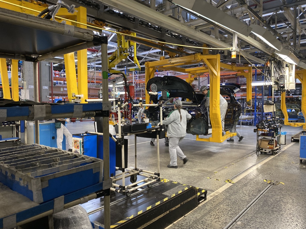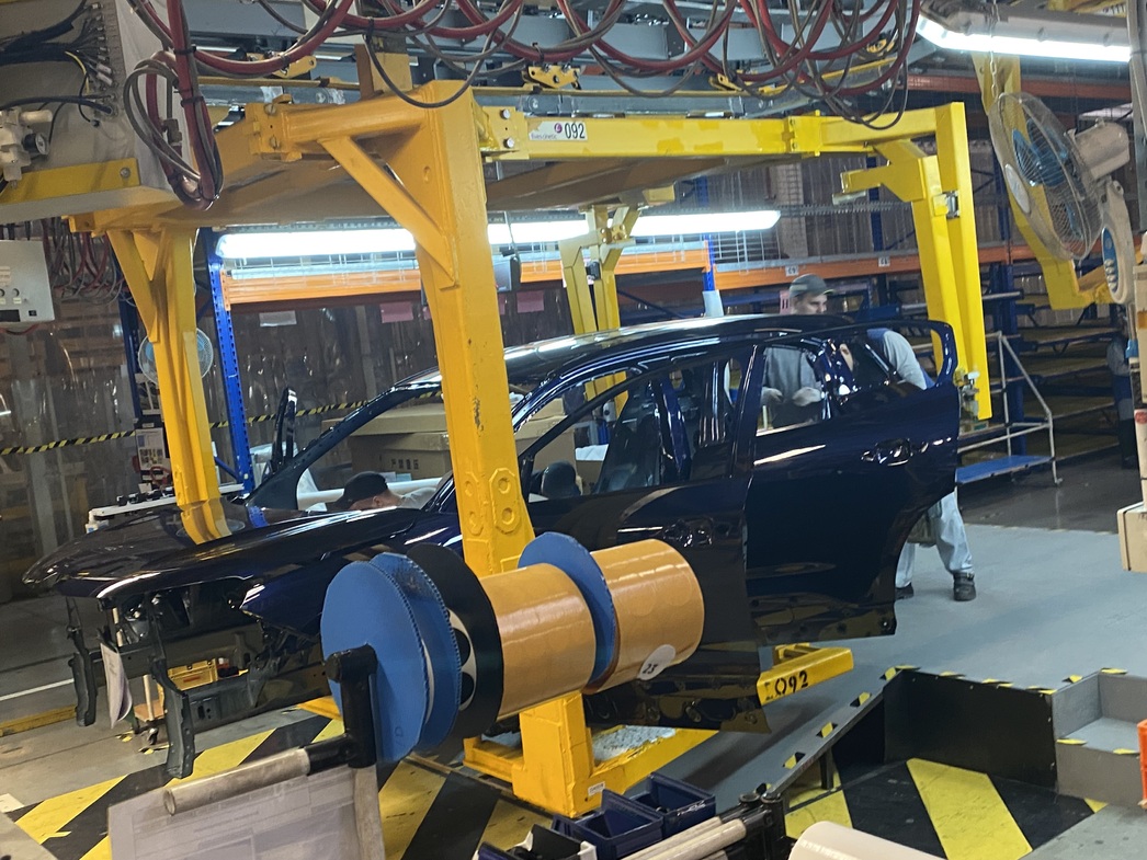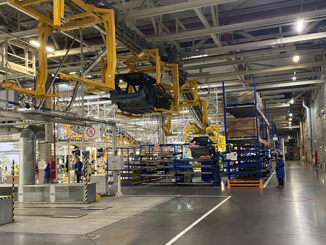 Как ни странно, но калужская сборка представляет собой не «прикрутили четыре колеса гайковертом», а более серьезные и глубокие процессы. На завод поступают окрашенные кузова, а все остальное инсталлируется уже руками отечественных рабочих на 78 постах. Конвейер, на первый взгляд, проходит некоторую обкатку: захваты с кузовами чередуются с пустыми ячейками, повсеместно развешаны подсказки с периодичностью операций, сотрудников — всего 121 человек. Да и машинокомплектов на данный момент лишь сотня.