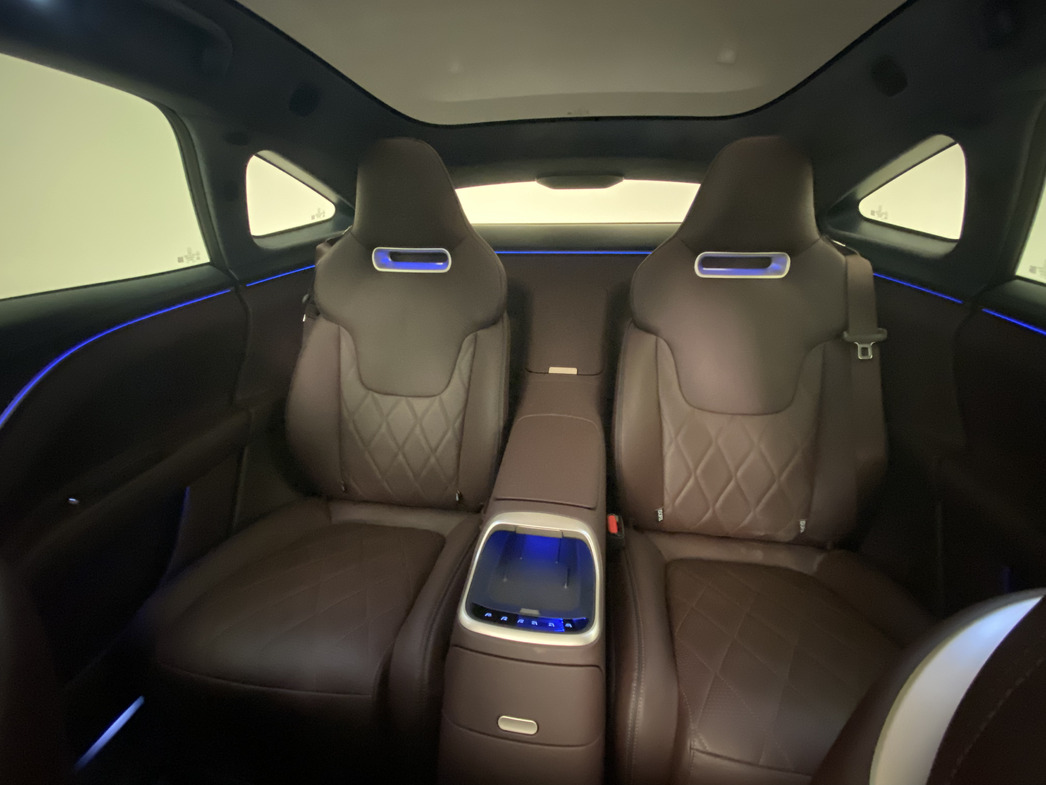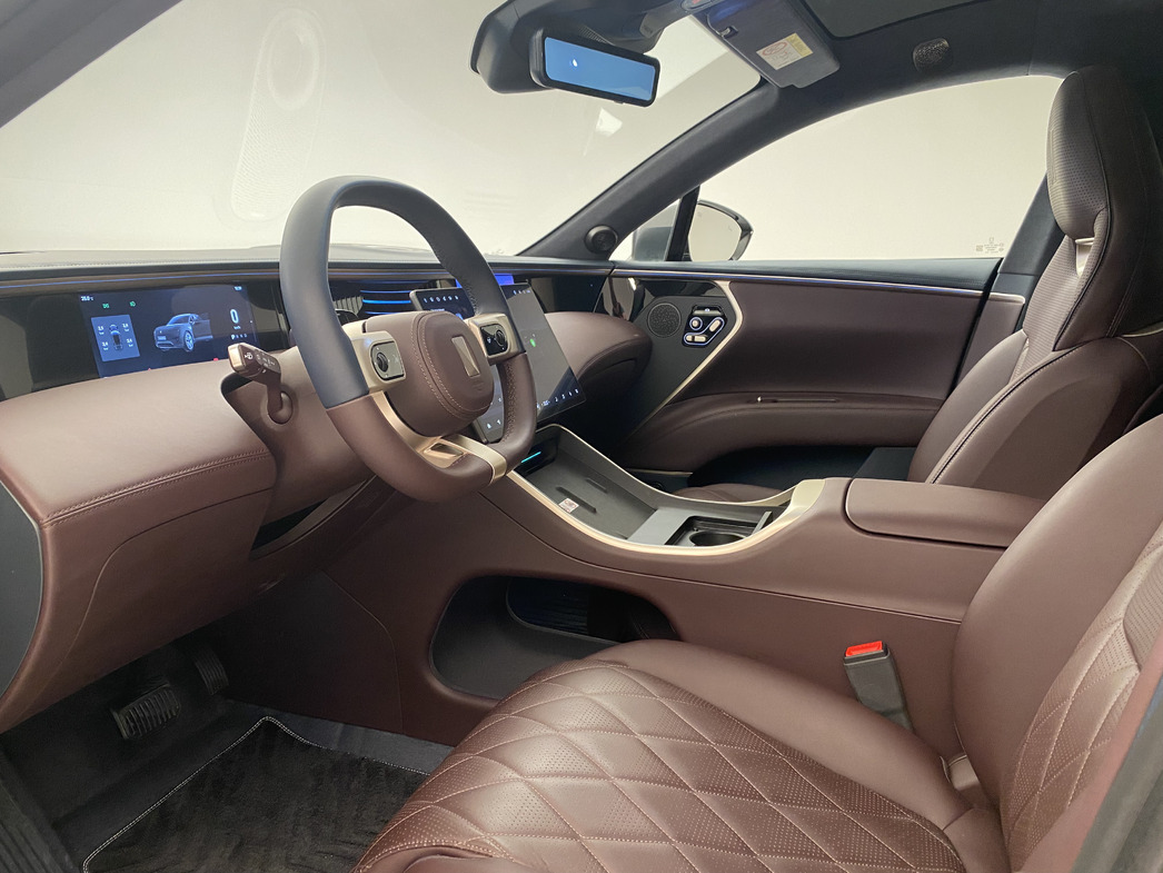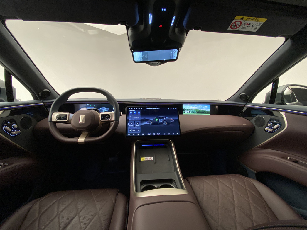 Внутри — китайская роскошь в хорошем смысле и предельное на сегодняшний день оснащение: приятные глазу оттенки натуральной кожи, стеклянный потолок с отделкой из алькантары, огромный, размером с телевизор, экран мультимедийной системы, стерео Meridian, «умное» зеркало заднего вида — только видео, никакого отражения. Экранов — три: для водителя с приборами, 15,6-дюймовый центральный и отдельный для переднего пассажира.