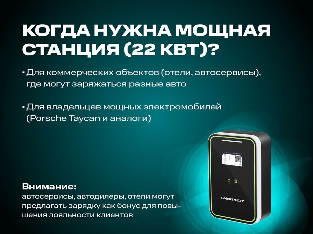 Кстати, электрозарядные станции SMARTWATT подходят не только для домашнего, но и для коммерческого использования. Установка нескольких ЭЗС может расширить перечень услуг и повысить лояльность клиентов автосервисов, автодилеров, отелей, гостиниц и торговых центров — подзарядка авто клиента может быть приятным бонусом или самостоятельной позицией в прайсе. А благодаря долгому сроку службы, устойчивости к погодным капризам и наличию удобного мобильного приложения установка ЭЗС становится выгодным долгосрочным вложением, а ее эксплуатация — простой и удобной.