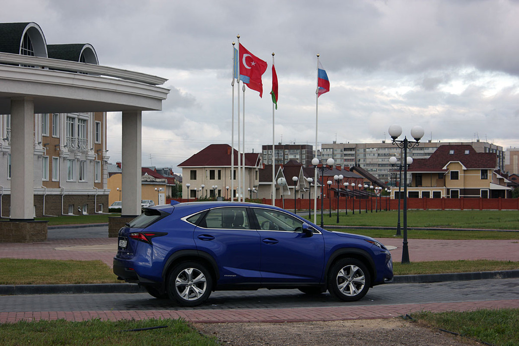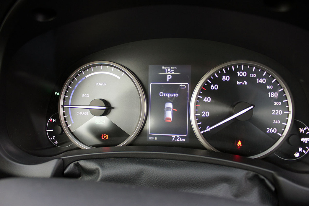 Но самое интересное начинается в тот момент, когда нажимаешь кнопку запуска двигателя: кажется, что мотор в обычном для нас понимании здесь полностью отсутсвует — в салоне полнейший акустический рай, MarkLevinson идеально «прокачивает» Pink Floyd, и лишь с набором скорости слышишь легкий шелест шин. А все оттого, что Lexus NX 300h — не просто бензиновая «повозка», а технологически сложный гибрид, вооруженный не только ДВС мощностью 155 л.с., но и парой электрических моторов (суммарно дают еще 42 «кобылы») — по одному на каждую ось. И управляется весь этот хай-тек при помощи какого-то колдовства: машина будто чувствует всеми своими электронными мозгами, когда вы поставили ногу на педаль газа, понимает, когда нужно ускориться. И сопровождается все это представление анимацией на центральном дисплее. Да так, что уже сам подсознательно начинаешь играть в «экологическое ралли». Что, собственно, абсолютно закономерно — 300h не создан для светофорных гонок. Хотя в этом кроется огромный плюс — все камеры контроля скорости, как ни старайся, обхитрить нельзя. Но все вышесказанное касается лишь режима Eco, когда педаль газа настолько задемпфирована, что отклик двигателя приходится ждать столетиями. Все меняется, как только переводишь селектор в режим Sport — руль наливается приятной тяжестью, подвеска становится жестче, практически не теряя энергоемкости, вместо «эконометра» на приборке сверкает тахометр, а мотор с удовольствием раскручивается до красной зоны. Соответственно, и сама динамика становится чуть не на порядок лучше: обгоны фур на трассе в таком режиме — плевое дело.