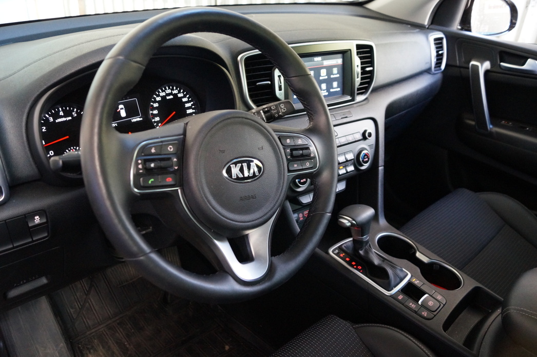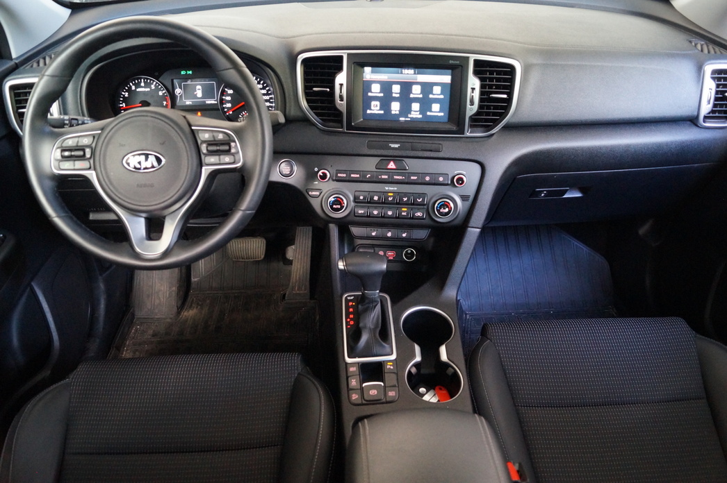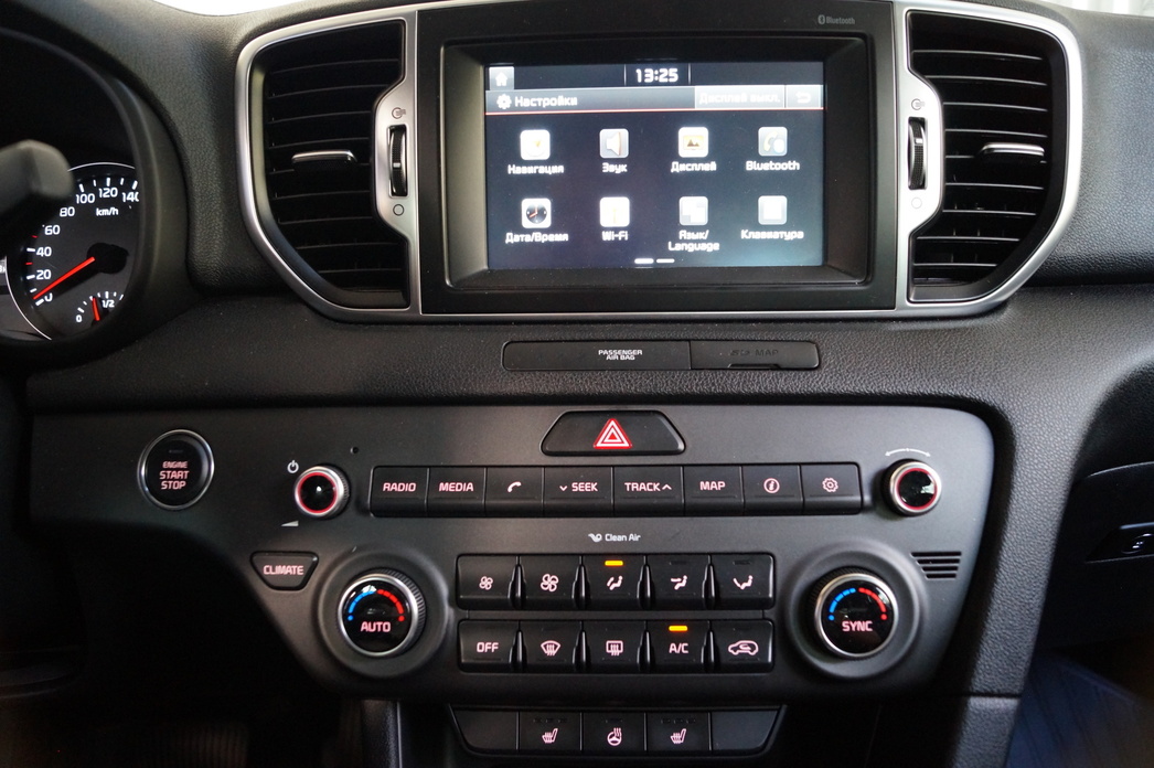 Философия, заложенная в гены каждого из автомобилей, находит продолжение и в салоне. Передняя панель Sportage простовата, если не сказать олдскульна, с невыразительной приборной консолью и традиционным дисплеем мультимедийной системы. В довершение всего, она перегружена множеством кнопок, ручек и крутилок. Одним словом — джип, настоящий джип.