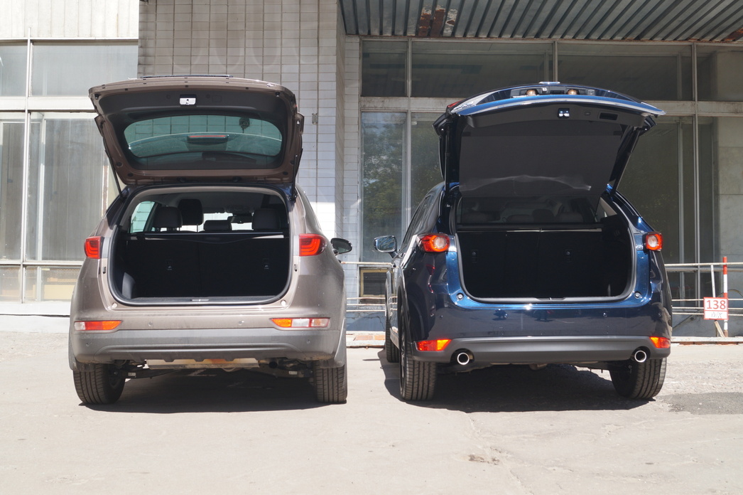 «Кореец» коренастее «японца» — он короче на 70 мм, шире на 15 мм и ниже на 35 мм. Его колесная база на 30 мм меньше, однако задним пассажирам почему-то куда вольготнее именно в Sportage: когда я сел сам за собой в оба автомобиля, то сразу же выяснил, что выигрыш по запасу места в KIA составляет несколько сантиметров. Так же непостижимым образом жалкие 1,5 см прибавки по ширине привели тут к появлению полноценного третьего места на диване — а в CX-5 я бы усадил на второй ряд троих только в крайнем случае и лишь для недолгой поездки.