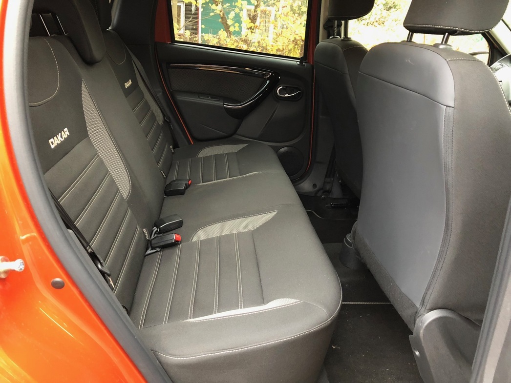 Что касается интерьера, то и тут водителю и пассажирам грех жаловаться. Это, разумеется, не премиум, но и откровенной бюджетностью не пахнет. Тканевая комбинированная обивка сидений (черно-серая гамма в оранжевом антураже — просто загляденье), матовый пластик и опять же вкрапления хрома (используемые материалы весьма добротны и качественны) сообщают отличное настроение в поездке, даже если за окном осенняя хмарь, а под колесами — не самое лучшее покрытие (впрочем, о дорожных способностях, умениях и повадках Renault Duster Dakar — чуть позже).