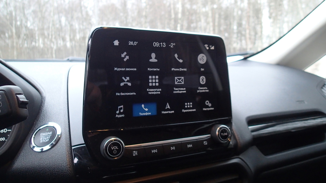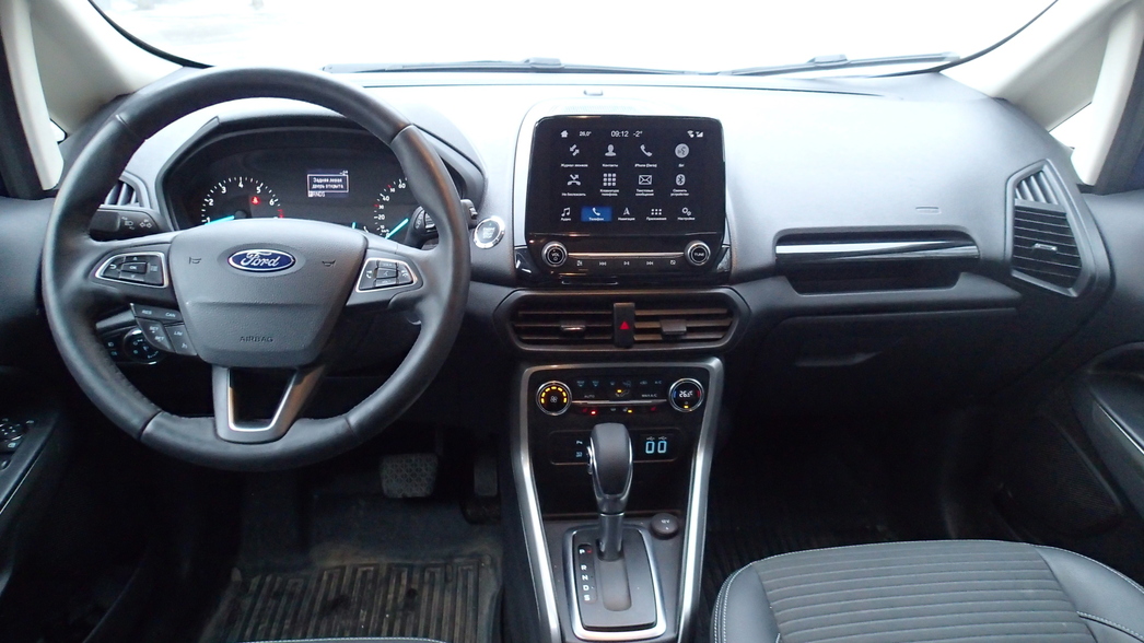 Внутри же EcoSport хоть и не блещет показной роскошью, зато вполне может порадовать эргономичностью — большой монитор по центру, на который выводится вся необходимая информация, тактильно понятный климат-контроль, удобный мультируль комфортного размера, традиционная хорошо читаемая приборная панель, обновленная мультимедийная система SYNC 3, поедающая и «яблоки», и «андроиды».