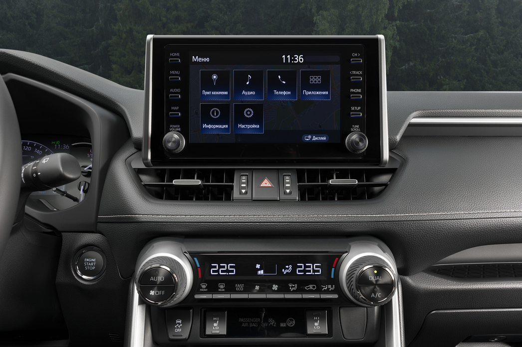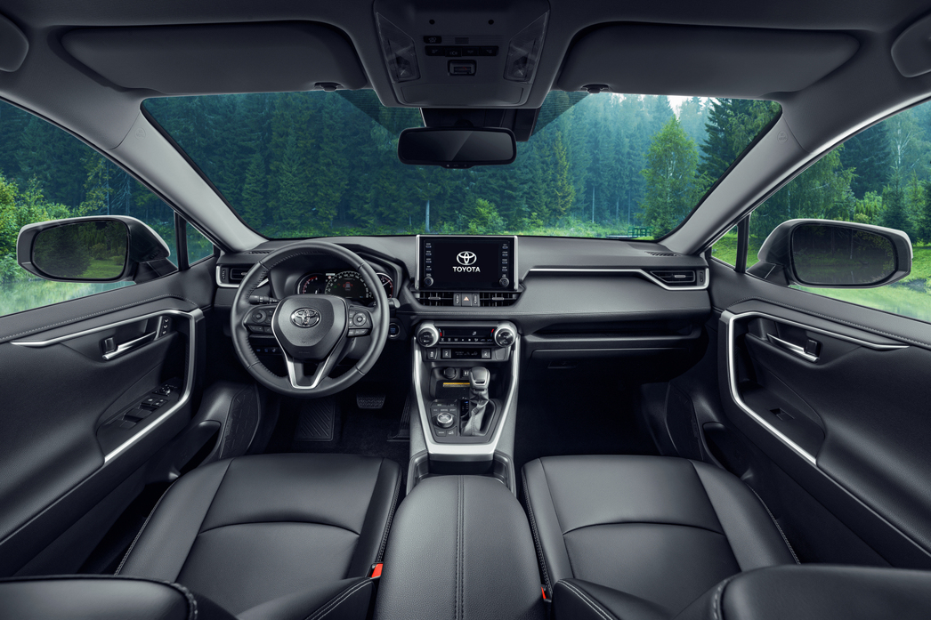 В базовой версии нового RAV4 имеются боковые зеркала с функцией складывания, 17-дюймовые колесные диски, кондиционер и тканевый салон. Кроме того, кроссовер укомплектован информационно-развлекательной системой с экраном диаметром семь дюймов без навигации.