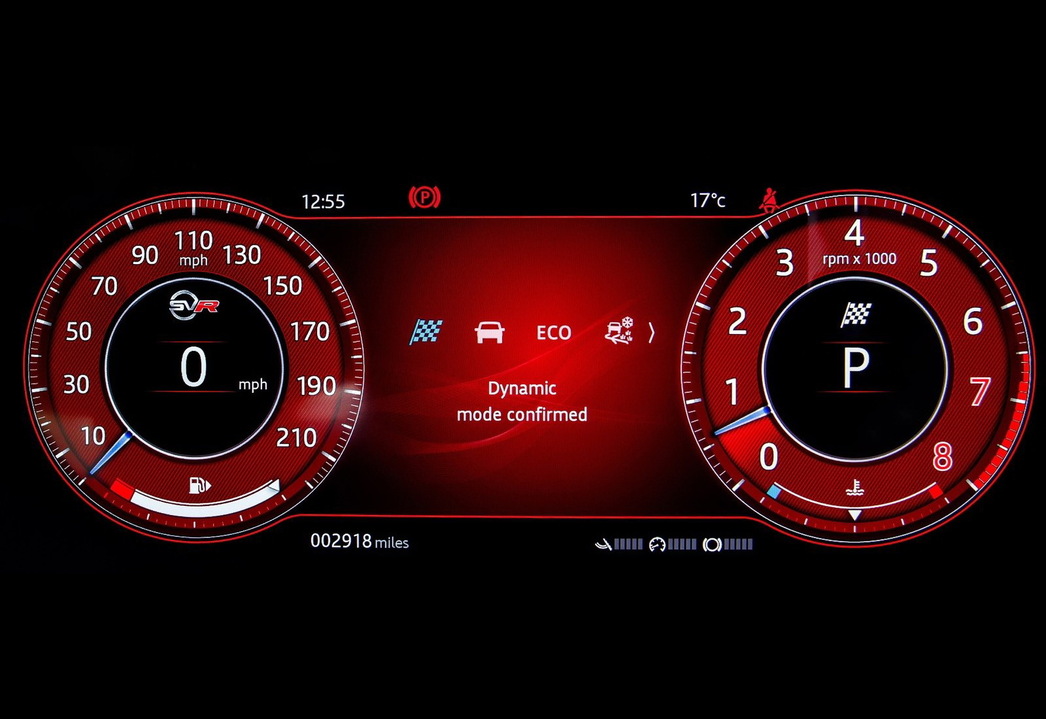 Итак, переводим автомобиль из стандартного в режим Dynamic (помните Terrain Response в Range Rover?) — подсветка салона тут же меняет белый дневной свет на кроваво-красный, коробку в режим Sport — погнали!