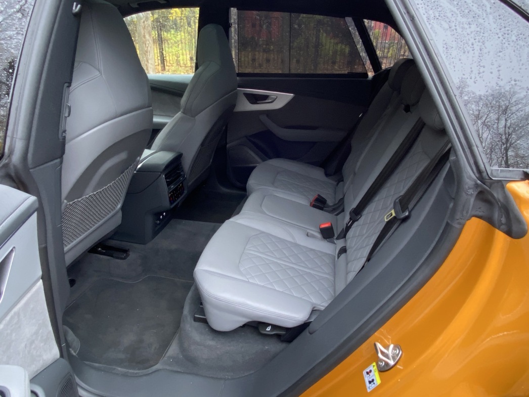 Если сказать, что это бомба — значит не сказать ничего. И я пока не имею в виду электронную начинку. Просто возвращаясь к скошенному кузову, обращаю ваше внимание, как отказ от следования тем самым трендам мирового автопрома сделал автомобиль необычайно просторным для задних пассажиров: расстояние от подушки дивана до потолка в Audi Q8 самое большое в классе. Иными словами, даже рослый мужчина не будет стеснен здесь по этому показателю.