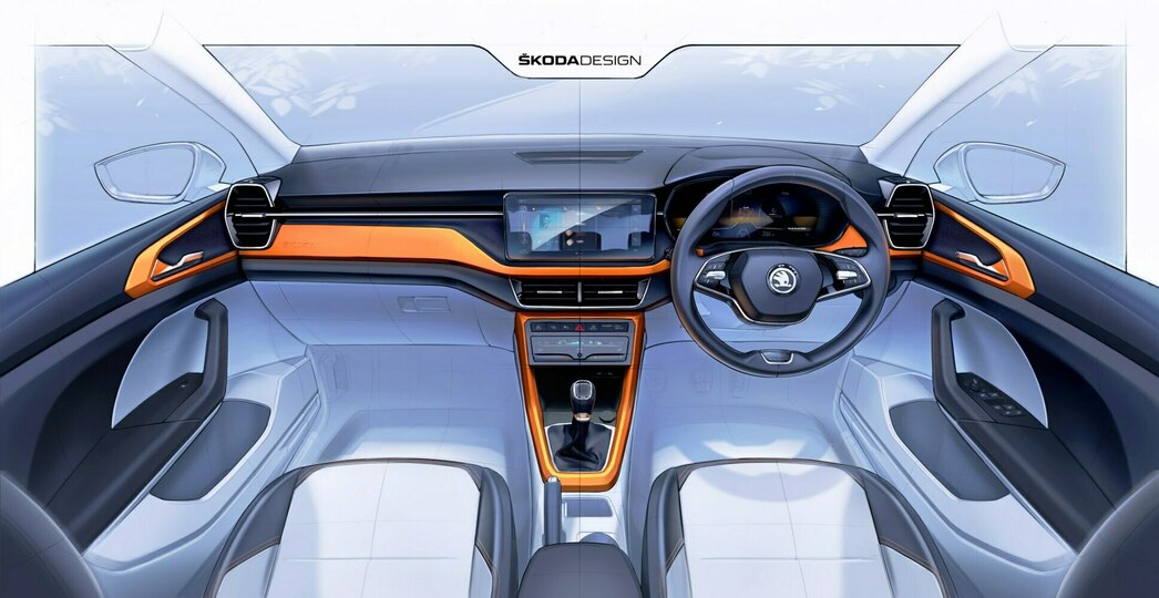 Кроме того, шкодовцы успели поделиться парой эскизов, которые прозрачно намекают на внешность грядущей новинки. А сейчас подоспели новые скетчи, раскрывающее оформление интерьера.
