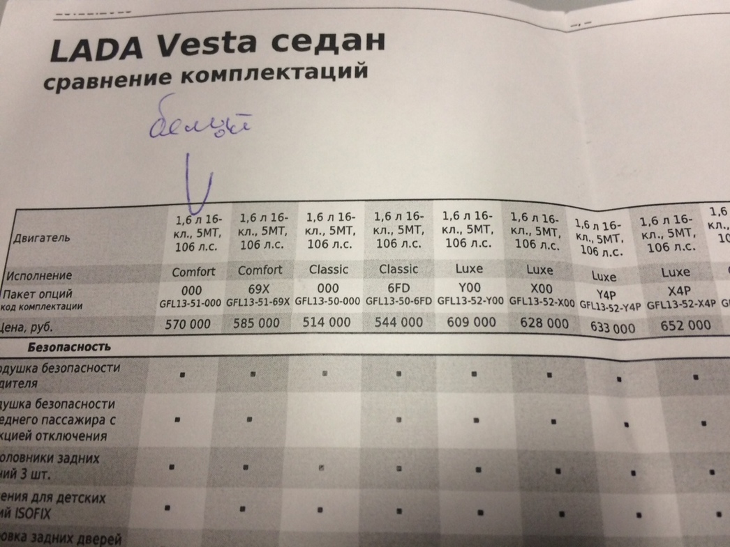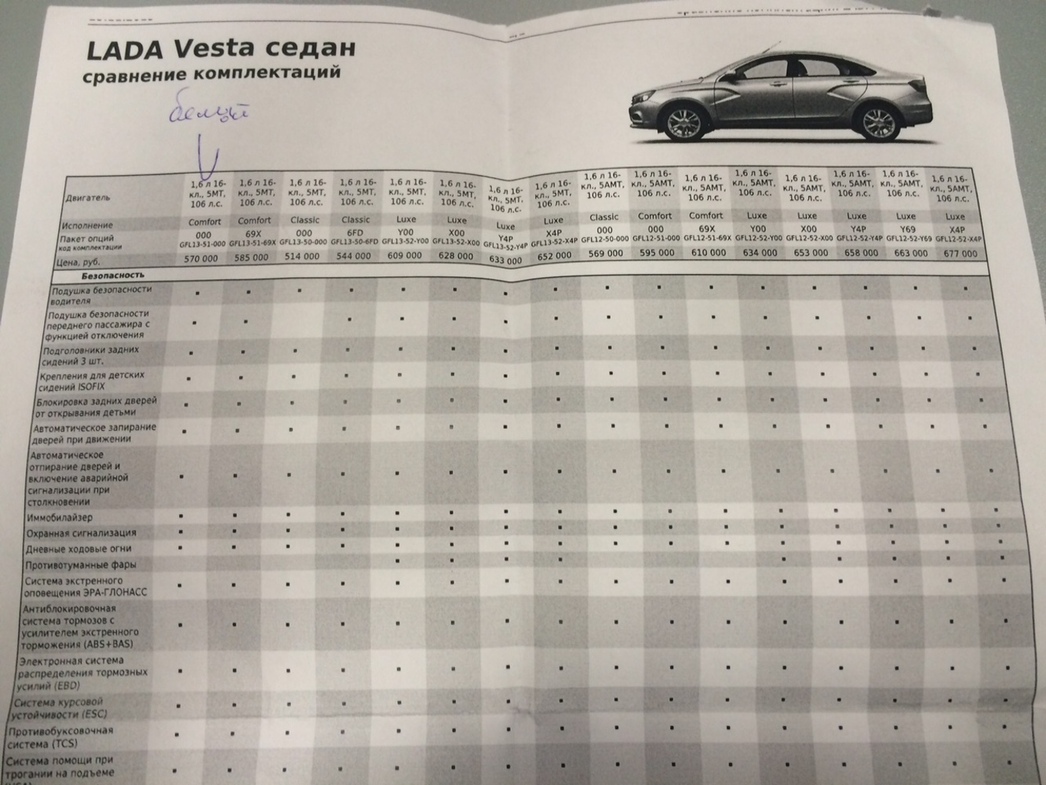 Поэтому, несмотря на уговоры присмотреться к «топовой» вариации аж за 677 000 рублей, в которой «есть все без исключения и даже больше» (правда, разницы, кроме как в наличии двух педалей вместо трех, я в спецификациях не нашел), меня вновь потянуло заговорить о базовой версии. И тогда доблестный сотрудник дилерского центра с грустью «вспомнил», что имеется у них авто в промежуточном варианте – Comfort за 570 000 рублей. Правда, в шоу-руме (явно не случайно) ее не оказалось – смотреть более вменяемую по цене «Весту» пришлось идти в соседнюю пристройку. Таковых экземпляров нашлось сразу несколько и от старших версий они отличаются отсутствием обогрева лобового стекла, электрических стеклоподъемников на задних дверях, мультируля, а также круиз-контроля, продвинутой мультимедиа с тачскрином, камеры заднего вида и легкосплавных колес.